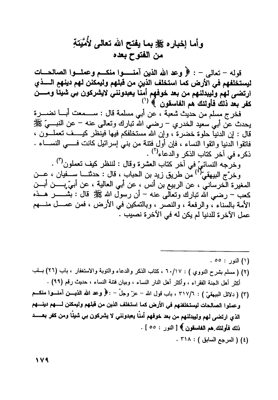 [ (3) ] (دلائل البيهقيّ) : 6/ 317، باب قول اللَّه- عزّ وجلّ-: وَعَدَ اللَّهُ الَّذِينَ آمَنُوا مِنْكُمْ وَعَمِلُوا الصَّالِحاتِ لَيَسْتَخْلِفَنَّهُمْ فِي الْأَرْضِ كَمَا اسْتَخْلَفَ الَّذِينَ مِنْ قَبْلِهِمْ وَلَيُمَكِّنَنَّ لَهُمْ دِينَهُمُ الَّذِي ارْتَضى لَهُمْ وَلَيُبَدِّلَنَّهُمْ مِنْ بَعْدِ خَوْفِهِمْ أَمْناً يَعْبُدُونَنِي لا يُشْرِكُونَ بِي شَيْئاً وَمَنْ كَفَرَ بَعْدَ ذلِكَ فَأُولئِكَ هُمُ الْفاسِقُونَ [النور: 55] .