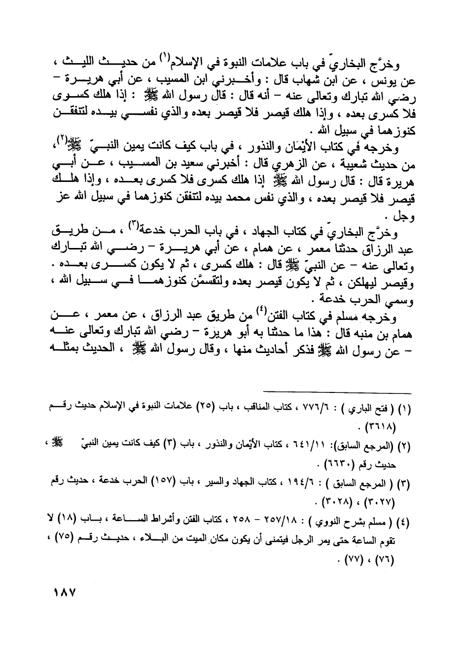 وخرّج البخاريّ في كتاب الجهاد، في باب الحرب خدعة [ (3) ] ، من طريق عبد الرزاق حدثنا معمر، عن همام، عن أبي هريرة- رضي اللَّه تبارك وتعالى عنه- عن النبيّ صلّى اللَّه عليه وسلّم قال: هلك كسرى، ثم لا يكون كسرى بعده.