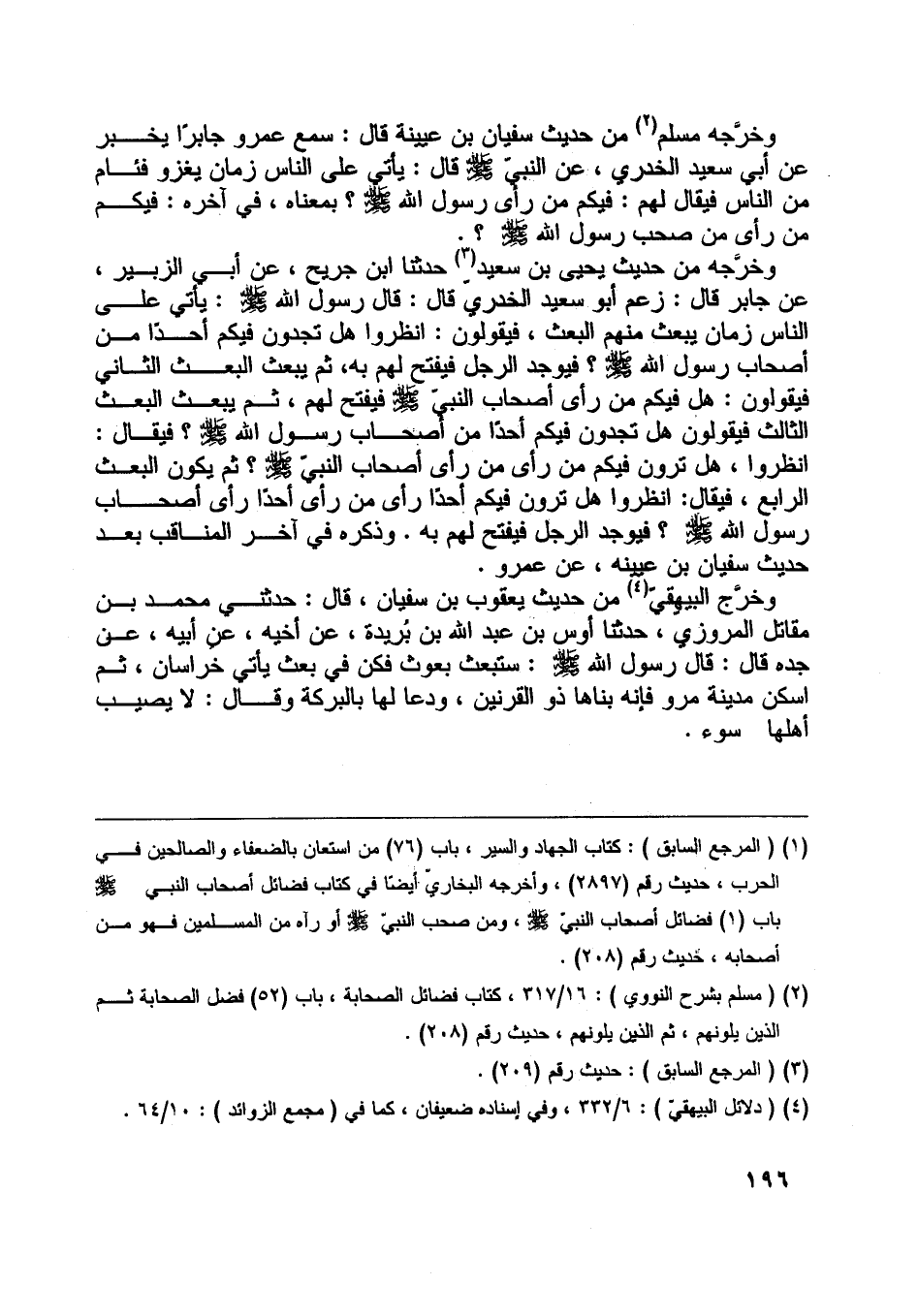 انظروا، هل ترون فيكم من رأى من رأى أصحاب النبيّ صلى اللَّه عليه وسلم؟ ثم يكون البعث الرابع، فيقال: انظروا هل ترون فيكم أحدا رأى من رأى أحدا رأى أصحاب رسول اللَّه صلى اللَّه عليه وسلم؟ فيوجد الرجل فيفتح لهم به. وذكره في آخر المناقب بعد حديث سفيان بن عيينة، عن عمرو.