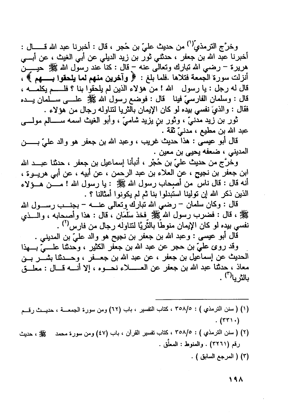 [ (1) ] (سنن الترمذي) : 5/ 358، كتاب التفسير، باب (62) ومن سورة الجمعة، حديث رقم (3310) .
