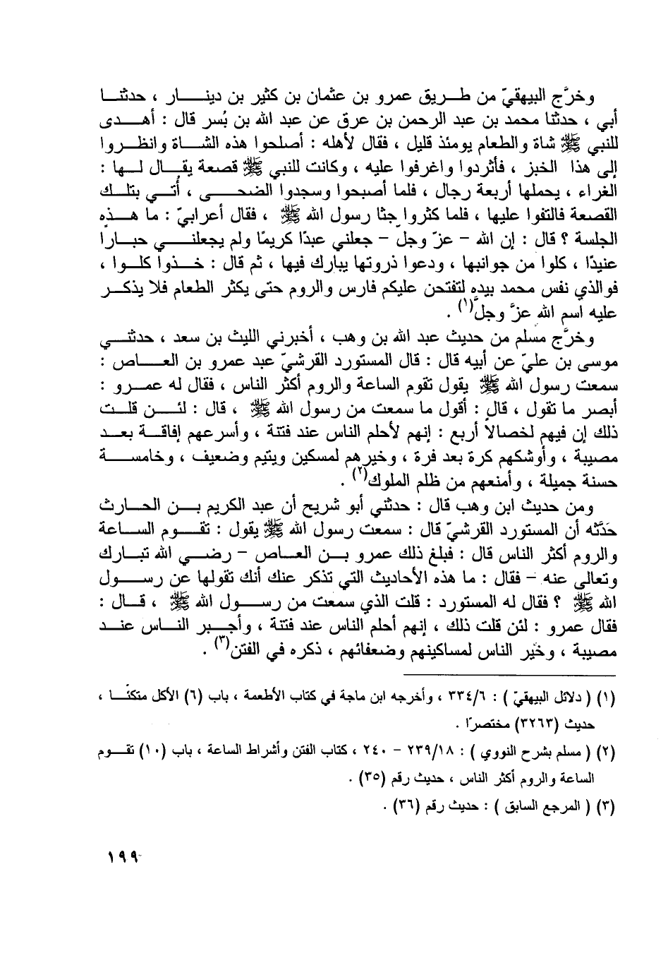 ومن حديث ابن وهب قال: حدثني أبو شريح أن عبد الكريم بن الحارث حدّثه أن المستورد القرشيّ قال: سمعت رسول اللَّه صلى اللَّه عليه وسلم يقول: تقوم الساعة والروم أكثر الناس قال: فبلغ ذلك عمرو بن العاص- رضي اللَّه تبارك وتعالى عنه- فقال: ما هذه الأحاديث التي تذكر عنك أنك تقولها عن رسول اللَّه صلى اللَّه عليه وسلم؟ فقال له المستورد: قلت الّذي سمعت من رسول اللَّه صلى اللَّه عليه وسلم، قال: