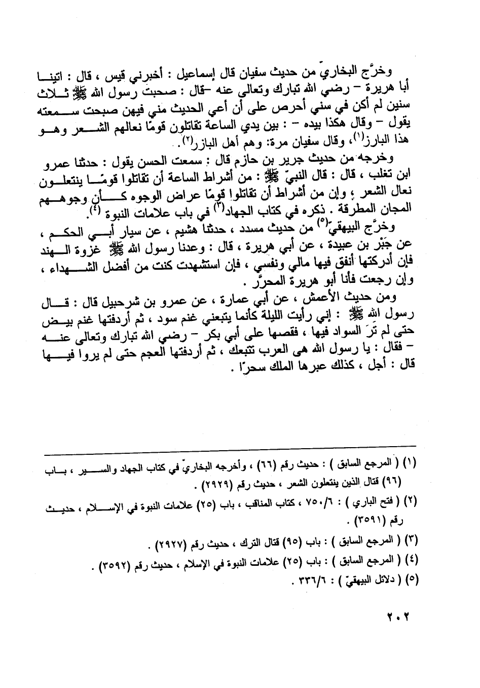 وخرّج البخاريّ من حديث سفيان قال إسماعيل: أخبرني قيس، قال: أتينا أبا هريرة- رضي اللَّه تبارك وتعالى عنه- قال: صحبت رسول اللَّه صلى اللَّه عليه وسلم ثلاث سنين لم أكن في سني أحرص على أن أعي الحديث مني فيهن صبحت سمعته يقول- وقال هكذا بيده-: بين يدي الساعة تقاتلون قوما نعالهم الشعر وهو هذا البارز [ (1) ] ، وقال سفيان مرة: وهم أهل البازر [ (2) ] .