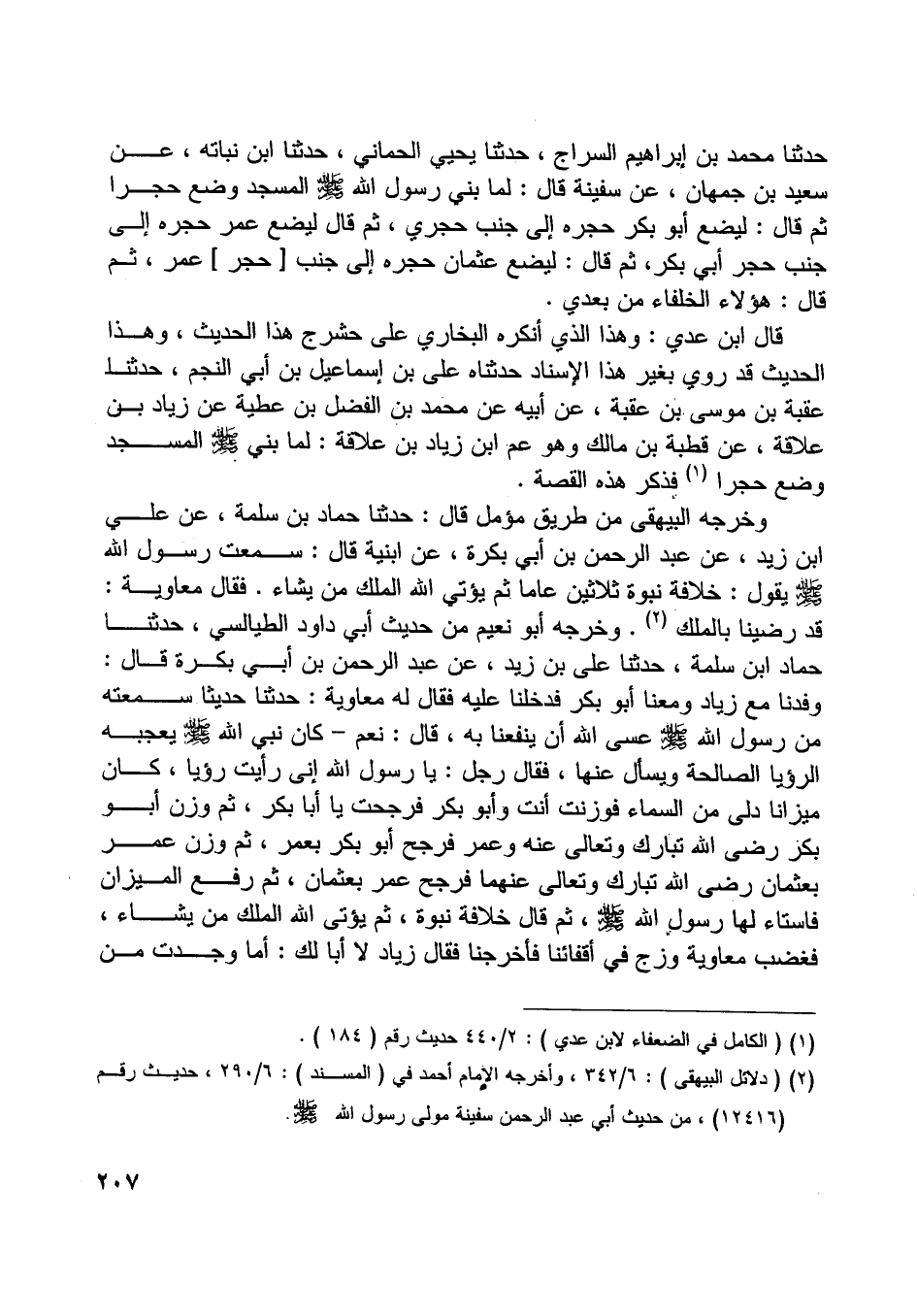 حدثنا محمد بن إبراهيم السراج، حدثنا يحيي الحماني، حدثنا ابن نباته، عن سعيد بن جمهان، عن سفينة قال: لما بني رسول اللَّه صلى اللَّه عليه وسلم المسجد وضع حجرا ثم قال: ليضع أبو بكر حجره إلى جنب حجري، ثم قال ليضع عمر حجره إلى جنب حجر أبي بكر، ثم قال: ليضع عثمان حجره إلى جنب [حجر] عمر، ثم قال: هؤلاء الخلفاء من بعدي.