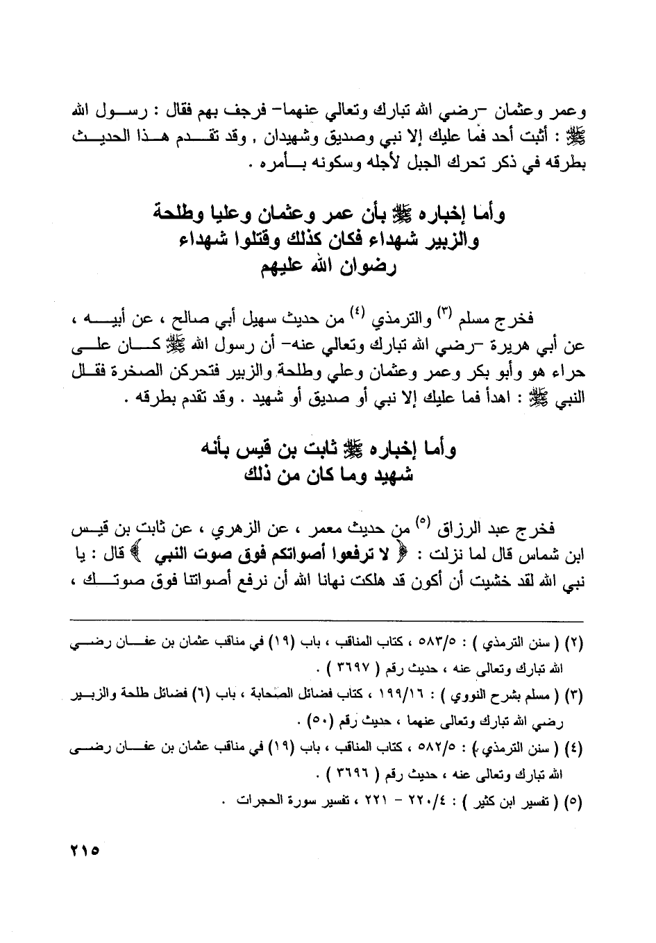 فخرج مسلم [ (2) ] والترمذي [ (3) ] من حديث سهيل أبي صالح، عن أبيه، عن أبي هريرة- رضي اللَّه تبارك وتعالى عنه- أن رسول اللَّه صلى اللَّه عليه وسلم كان على حراء هو وأبو بكر وعمر وعثمان وعلي وطلحة والزبير فتحركت الصخرة فقال النبي صلى اللَّه عليه وسلم: اهدأ فما عليك إلا نبي أو صديق أو شهيد. وقد تقدم بطرقه.