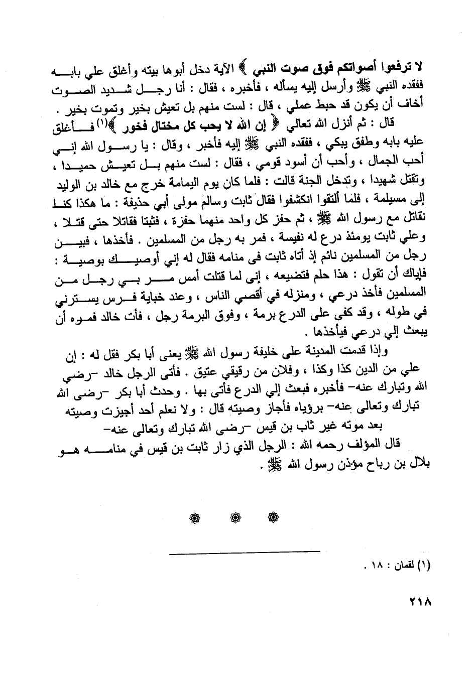 وإذا قدمت المدينة على خليفة رسول اللَّه صلى اللَّه عليه وسلم يعنى أبا بكر فقل له: إن علي من الدين كذا وكذا، وفلان من رقيقي عتيق. فأتى الرجل خالد- رضي اللَّه وتبارك عنه- فأخبره فبعث إلي الدرع فأتى بها. وحدث أبا بكر- رضي اللَّه تبارك وتعالى عنه- برؤياه فأجاز وصيته قال: ولا نعلم أحد أجيزت وصيته بعد موته غير ثاب بن قيس- رضي اللَّه تبارك وتعالى عنه- قال المؤلف رحمه اللَّه: الرجل الّذي زار ثابت بن قيس في منامه هو بلال بن رباح مؤذن رسول اللَّه صلى اللَّه عليه وسلم.