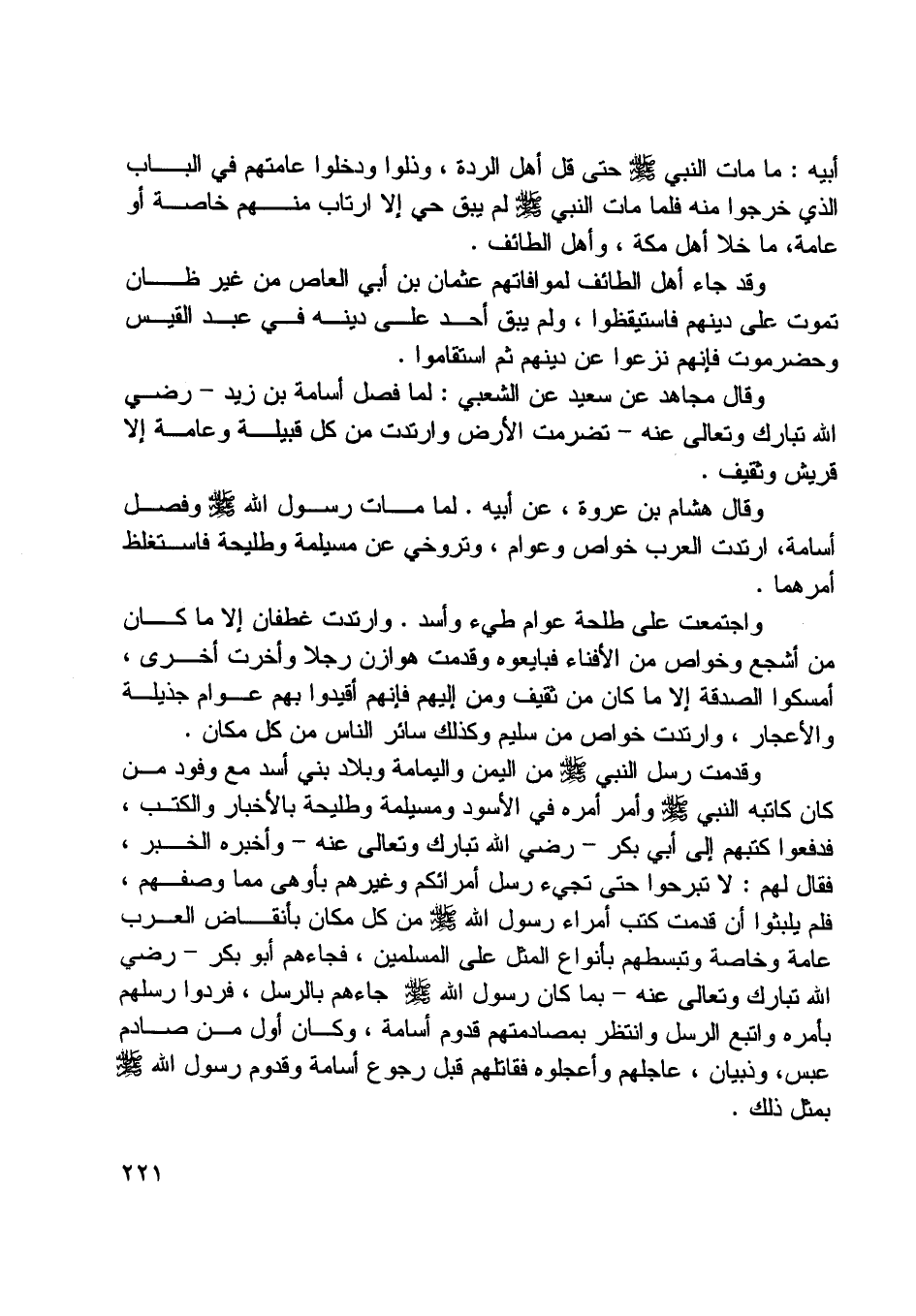 وقال هشام بن عروة، عن أبيه. لما مات رسول اللَّه صلى اللَّه عليه وسلم وفصل أسامة، ارتدت العرب خواص وعوام، وتروخي عن مسيلمة وطليحة فاستغلظ أمرهما.