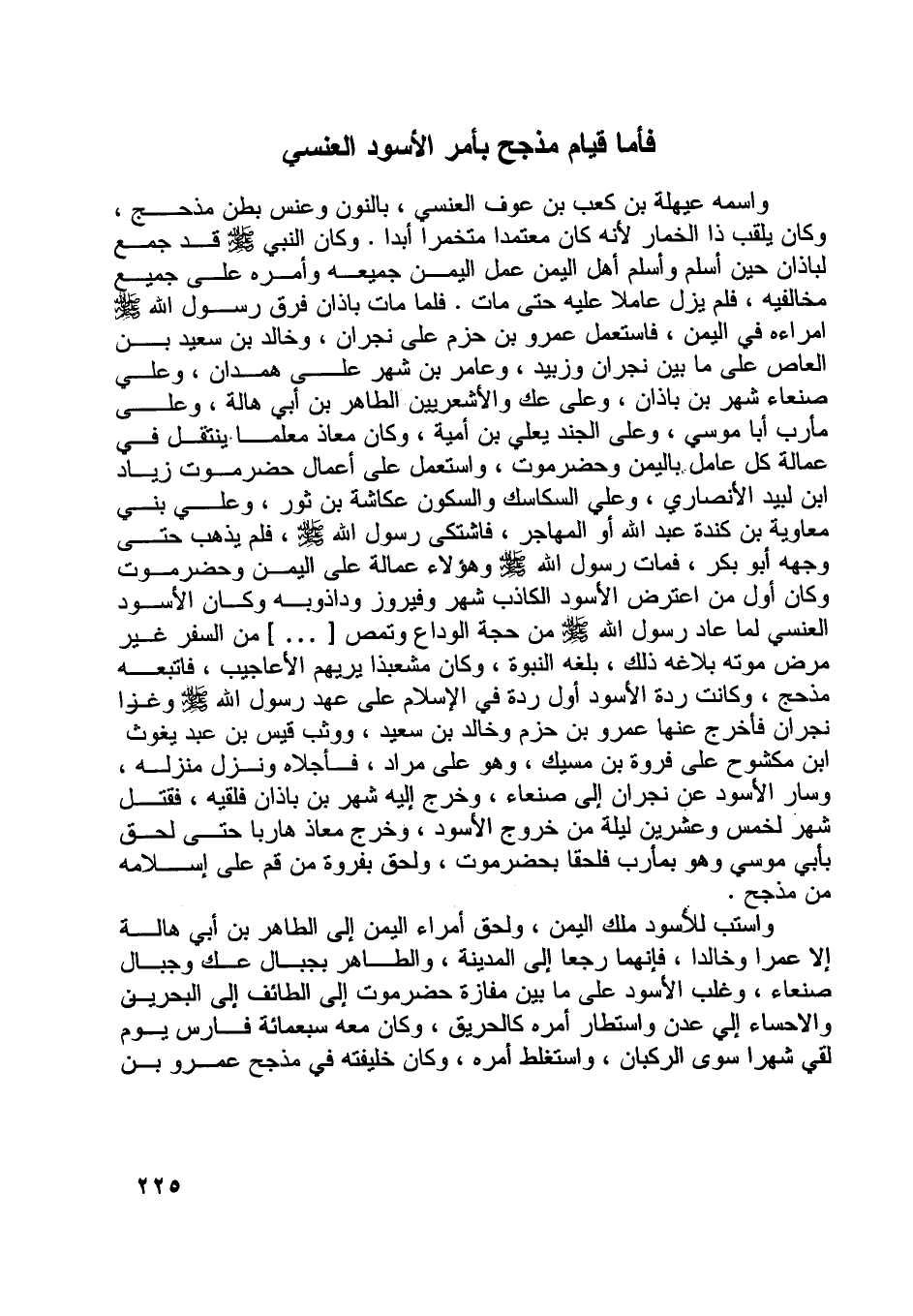 واسمه عيهلة بن كعب بن عوف العنسيّ، بالنون وعنس بطن مذحج، وكان يلقب ذا الخمار لأنه كان معتمدا متخمرا أبدا. وكان النبي صلى اللَّه عليه وسلم قد جمع لباذان حين أسلم وأسلم أهل اليمن عمل اليمن جميعه وأمره على جميع مخالفيه، فلم يزل عاملا عليه حتى مات. فلما مات باذان فرق رسول اللَّه صلى اللَّه عليه وسلم أمراءه في اليمن، فاستعمل عمرو بن حزم على نجران، وخالد بن سعيد بن العاص على ما بين نجران وزبيد، وعامر بن شهر على همدان، وعلي صنعاء شهر بن باذان، وعلى عك والأشعريين الطاهر بن أبي هالة، وعلى مأرب أبا موسى، وعلى الجند يعلي بن أمية، وكان معاذ معلما ينتقل في عمالة كل عامل باليمن وحضرموت، واستعمل على أعمال حضرموت زياد ابن لبيد الأنصاري، وعلي السكاسك والسكون عكاشة بن ثور، وعلي بني معاوية بن كندة عبد اللَّه أو المهاجر، فاشتكى رسول اللَّه صلى اللَّه عليه وسلم، فلم يذهب حتى وجهه أبو بكر، فمات رسول اللَّه صلى اللَّه عليه وسلم وهؤلاء عمالة على اليمن وحضرموت وكان أول من اعترض الأسود الكاذب شهر وفيروز وداذويه وكان الأسود العنسيّ لما عاد رسول اللَّه صلى اللَّه عليه وسلم من حجة الوداع وتمص [ ... ] من السفر غير مرض موته بلاغه ذلك، بلغه النبوة، وكان مشعبذا يريهم الأعاجيب، فاتبعه مذحج، وكانت ردة الأسود أول ردة في الإسلام على عهد رسول اللَّه صلى اللَّه عليه وسلم وغزا نجران فأخرج عنها عمرو بن حزم وخالد بن سعيد، ووثب قيس بن عبد يغوث، ابن مكشوح على فروة بن مسيك، وهو على مراد، فأجلاه ونزل منزله، وسار الأسود عن نجران إلى صنعاء، وخرج إليه شهر بن باذان فلقيه، فقتل شهر لخمس وعشرين ليلة من خروج الأسود، وخرج معاذ هاربا حتى لحق بأبي موسي وهو بمأرب فلحقا بحضرموت، ولحق بفروة من قم على إسلامه من مذجح.