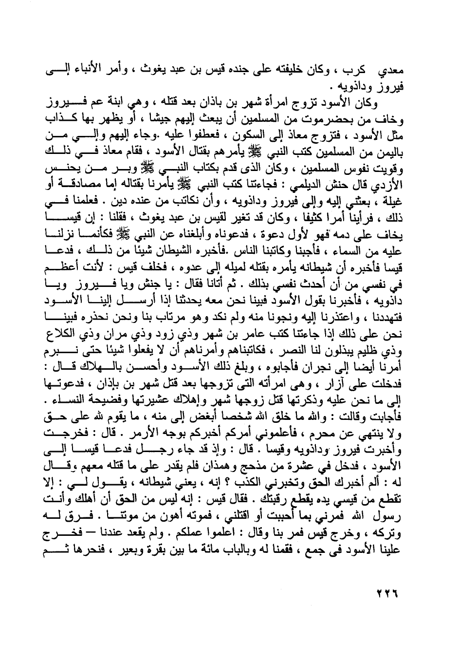 فأجابت وقالت: واللَّه ما خلق اللَّه شخصا أبغض إلى منه، ما يقوم للَّه على حق ولا ينتهي عن محرم، فأعلموني أمركم أخبركم بوجه الأمر. قال: فخرجت وأخبرت فيروز وداذويه وقيسا. قال: وإذ قد جاء رجل فدعا قيسا إلى الأسود، فدخل في عشرة من مذحج وهمذان فلم يقدر على ما قتله معهم وقال له: ألم أخبرك الحق وتخبرني الكذب؟ إنه، يعني شيطانه، يقول لي: إلا تقطع من قيسي يده يقطع رقبتك. فقال قيس: إنه ليس من الحق أن أهلك وأنت رسول اللَّه فمرني بما أحببت أو اقتلني، فموته أهون من موتنا. فرق له وتركه، وخرج قيس فمر بنا وقال: اعلموا عملكم. ولم يقعد عندنا- فخرج علينا الأسود في جمع، فقمنا له وبالباب مائة ما بين بقرة وبعير، فنحرها ثم
