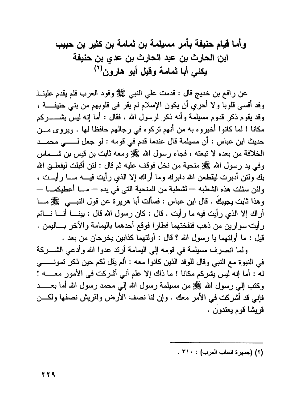 وأما قيام حنيفة بأمر مسيلمة بن ثمامة بن كثير بن حبيب ابن الحارث بن عبد الحارث بن عدي بن حنيفة يكنى أبا ثمامة وقيل أبو هارون [ (2) ]