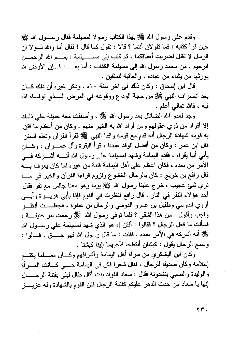 وقدم علي رسول اللَّه صلى اللَّه عليه وسلم بهذا الكتاب رسولا لمسيلمة فقال رسول اللَّه صلى اللَّه عليه وسلم حين قرأ كتابه: فما تقولان أنتما؟ قالا: نقول كما قال! فقال أما واللَّه لولا ان الرسل لا تقتل لضربت أعناقكما، ثم كتب إلى مسيلمة: بسم اللَّه الرحمن الرحيم. من محمد رسول اللَّه إلى مسيلمة الكذاب: أما بعد فإن الأرض للَّه يورثها من يشاء من عباده، والعاقبة للمتقين.
