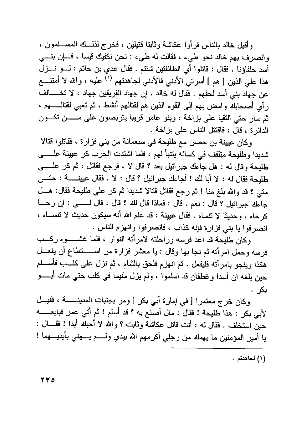 وأقبل خالد بالناس فرأوا عكاشة وثابتا قتيلين، فخرج لذلك المسلمون، وانصرف بهم خالد نحو طيِّئ، فقالت له طيِّئ: نحن نكفيك قيسا، فإن بني أسد حلفاؤنا. فقال: قاتلوا أي الطائفتين شئتم. فقال عدي بن حاتم: لو نزل هذا علي الذين [هم] أسرتي الأدنى فالأدنى لجاهدتهم [ (1) ] عليه، واللَّه لا أمتنع عن جهاد بني أسد لحلفهم. فقال له خالد. إن جهاد الفريقين جهاد، لا تخالف رأي أصحابك وامض بهم إلى القوم الذين هم لقتالهم أنشط، ثم تعبي لقتالهم، ثم سار حتى التقيا على بزاخة، وبنو عامر قريبا يتربصون على من تكون الدائرة، قال: فاقتتل الناس على بزاخة.