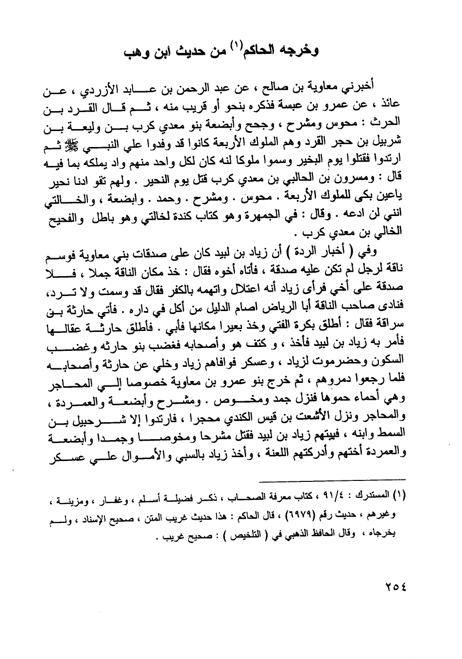 أخبرني معاوية بن صالح، عن عبد الرحمن بن عابد الأزردي، عن عائذ، عن عمرو بن عبسة فذكره بنحو أو قريب منه، ثم قال القرد بن الحرث: محوس ومشرح، وجحح وأبضعة بنو معديكرب بن وليعة بن شرحبيل بن حجر القرد وهم الملوك الأربعة كانوا قد وفدوا على النبي صلّى اللَّه عليه وسلّم ثم ارتدوا فقتلوا يوم البخير وسموا ملوكا لأنه كان لكل واحد منهم واد يملكه بما فيه قال: ومسرون بن الحالبي بن معديكرب قتل يوم النحير. ولهم تقو ادنا نحير يا عين بكى للملوك الأربعة. محوس. ومشرح. وحمد. وابضعة، والخالتي انني لن ادعه. وقال: في الجمهرة وهو كتاب كندة لخالتي وهو باطل والفحيح الخالي بن معديكرب.