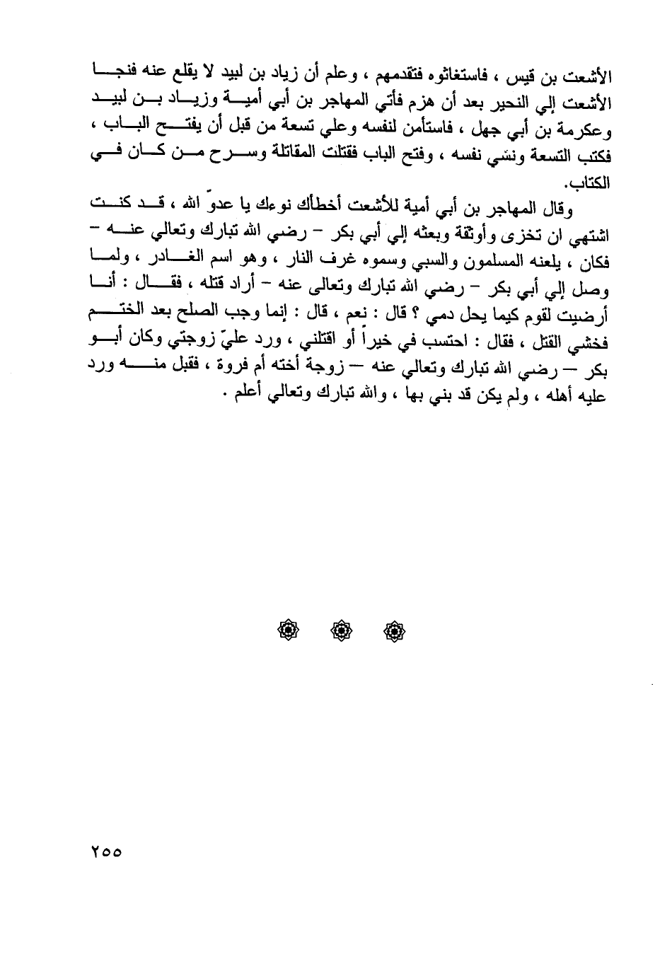 وقال المهاجر بن أبي أمية للأشعث أخطأك نوؤك يا عدوّ اللَّه، قد كنت اشتهي ان تخزى وأوثقه وبعثه إلي أبي بكر- رضي اللَّه تبارك وتعالي عنه- فكان، يلعنه المسلمون والسبي وسموه غرف النار، وهو اسم الغادر، ولما وصل إلي أبي بكر- رضي اللَّه تبارك وتعالى عنه- أراد قتله، فقال: أنا أرضيت لقوم كيما يحل دمي؟ قال: نعم، قال: إنما وجب الصلح بعد الختم فخشي القتل، فقال: احتسب في خيرا أو اقتلني، ورد عليّ زوجتي وكان أبو بكر- رضي اللَّه تبارك وتعالي عنه- زوجة أخته أم فروة، فقبل منه ورد عليه أهله، ولم يكن قد بني بها، واللَّه تبارك وتعالي أعلم.