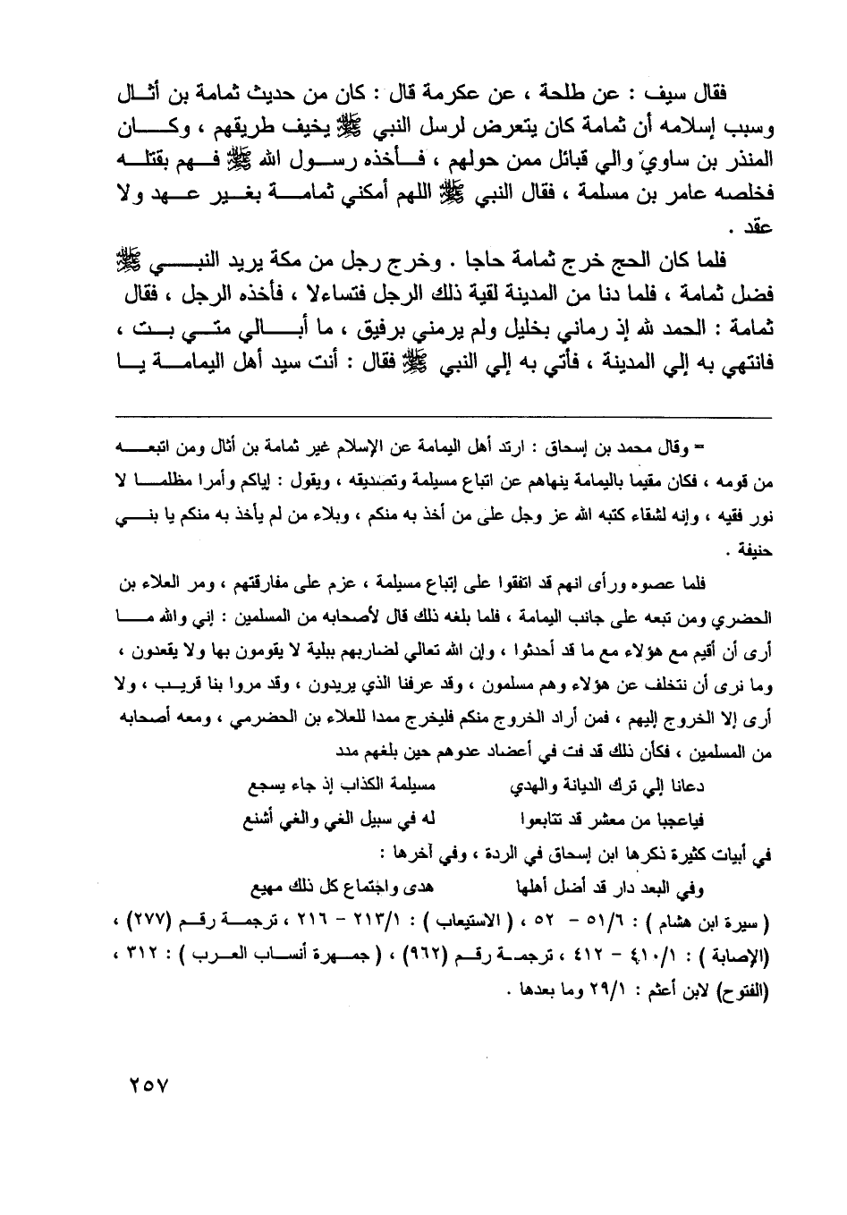 فقال سيف: عن طلحة، عن عكرمة قال: كان من حديث ثمامة بن أثال وسبب إسلامه أن ثمامة كان يتعرض لرسل النبي صلّى اللَّه عليه وسلّم يخيف طريقهم، وكان المنذر بن ساوي والي قبائل ممن حولهم، فأخذه رسول اللَّه صلّى اللَّه عليه وسلّم فهم بقتله فخلصه عامر بن مسلمة، فقال النبي صلّى اللَّه عليه وسلّم اللَّهمّ أمكني ثمامة بغير عهد ولا عقد.