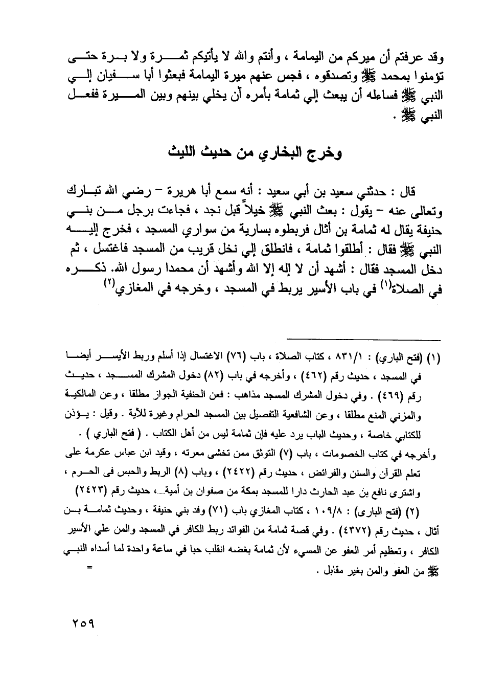 قال: حدثني سعيد بن أبي سعيد: أنه سمع أبا هريرة- رضي اللَّه تبارك وتعالى عنه- يقول: بعث النبي صلّى اللَّه عليه وسلّم خيلا قبل نجد، فجاءت برجل من بني حنيفة يقال له ثمامة بن أثال فربطوه بسارية من سواري المسجد، فخرج إليه النبي صلّى اللَّه عليه وسلّم فقال: أطلقوا ثمامة، فانطلق إلي نخل قريب من المسجد فاغتسل، ثم دخل المسجد فقال: أشهد أن لا إله إلا اللَّه وأشهد أن محمدا رسول اللَّه. ذكره في الصلاة [ (1) ] في باب الأسير يربط في المسجد، وخرجه في المغازي [ (2) ] .