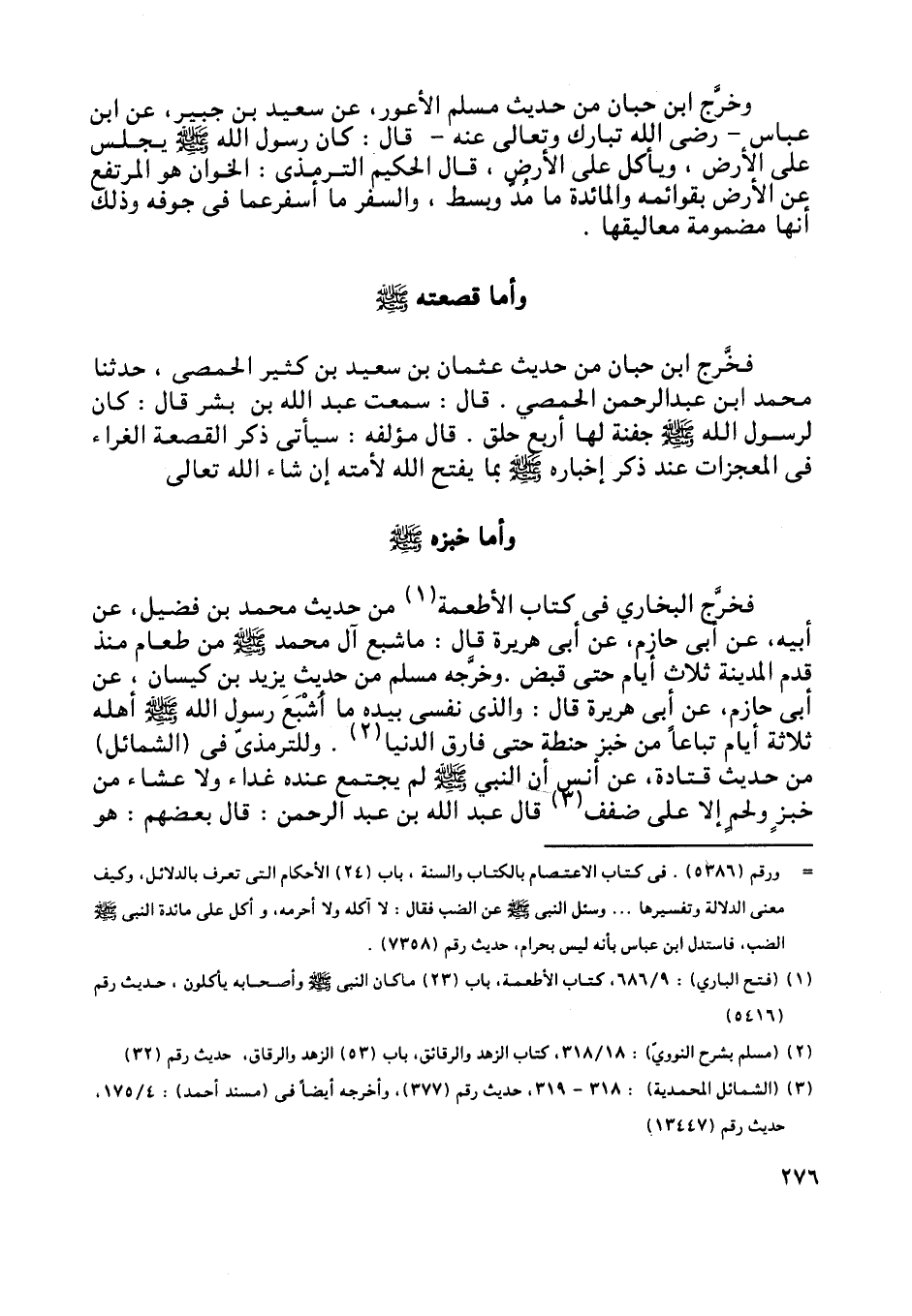 فخرّج ابن حبان من حديث عثمان بن سعيد بن كثير الحمصي، حدثنا محمد ابن عبد الرحمن الحمصي. قال: سمعت عبد اللَّه بن بشر قال: كان لرسول اللَّه صلى اللَّه عليه وسلم جفنة لها أربع حلق. قال مؤلفه: سيأتي ذكر القصعة الغراء في المعجزات عند ذكر إخباره صلى اللَّه عليه وسلم بما يفتح اللَّه لأمته إن شاء اللَّه تعالى.