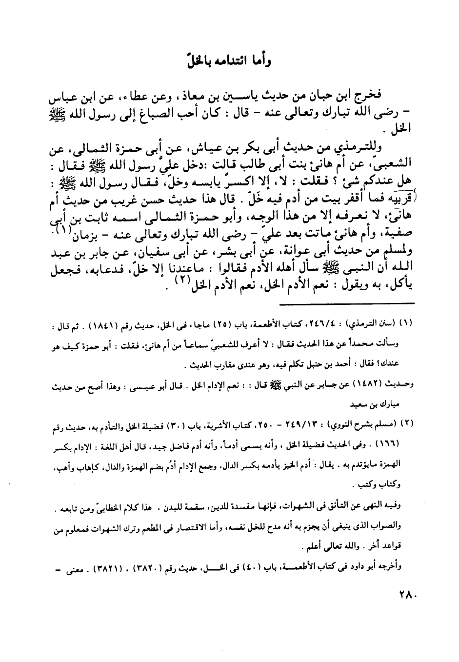 [ (2) ] (مسلم بشرح النووي) : 13/ 249- 250، كتاب الأشربة، باب (30) فضيلة الخل والتأدم به، حديث رقم (166) . وفي الحديث فضيلة الخل، وأنه يسمى أدما، وأنه أدم فاضل جيد، قال أهل اللغة: الإدام بكسر الهمزة ما يؤتدم به. يقال: أدم الخبز يأدمه بكسر الدال، وجمع الإدام أدم بضم الهمزة والدال، كإهاب وأهب، وكتاب وكتب.