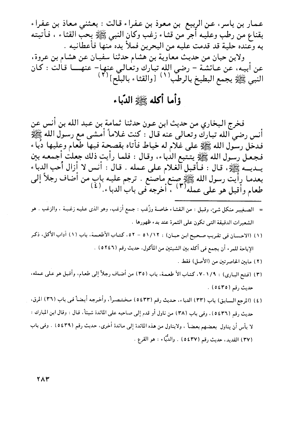 لا بأس أن يناول بعضهم بعضا، ولا يناول من هذه المائدة إلى مائدة أخرى، حديث رقم (5439) . وفي باب (37) القديد، حديث رقم (5437) . والدّبّاء: هو القرع.