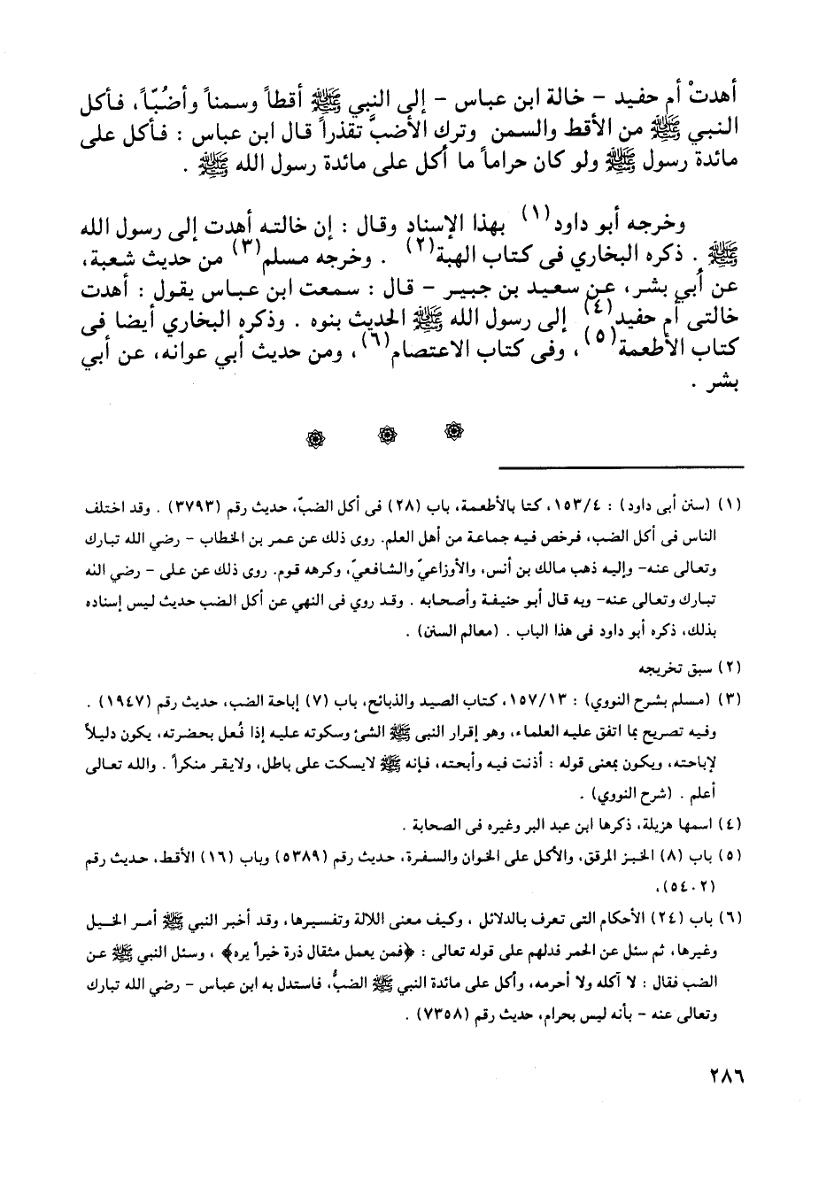 أهدت أم حفيد- خالة ابن عباس- إلى النبي صلى اللَّه عليه وسلم أقطا وسمنا وأضبّا، فأكل النبي صلى اللَّه عليه وسلم من الأقط والسمن وترك الأضبّ تقذرا قال ابن عباس: فأكل على مائدة رسول صلى اللَّه عليه وسلم ولو كان حراما ما أكل على مائدة رسول اللَّه صلى اللَّه عليه وسلم.