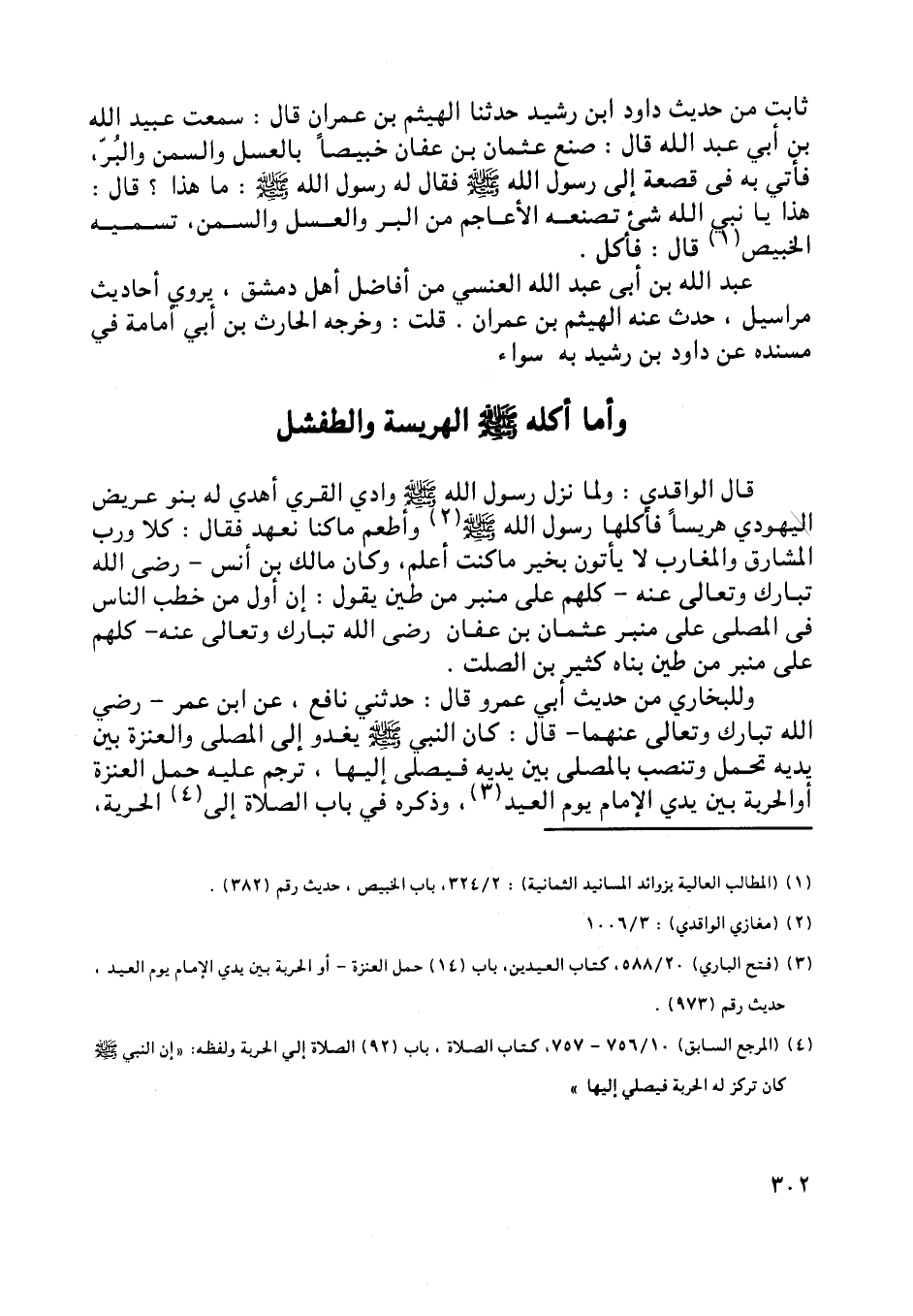ثابت من حديث داود ابن رشيد حدثنا الهيثم بن عمران قال: سمعت عبيد اللَّه بن أبي عبد اللَّه قال: صنع عثمان بن عفان خبيصا بالعسل والسمن والبرّ، فأتي به في قصعة إلى رسول اللَّه صلى اللَّه عليه وسلم فقال له رسول اللَّه صلى اللَّه عليه وسلم: ما هذا؟ قال: