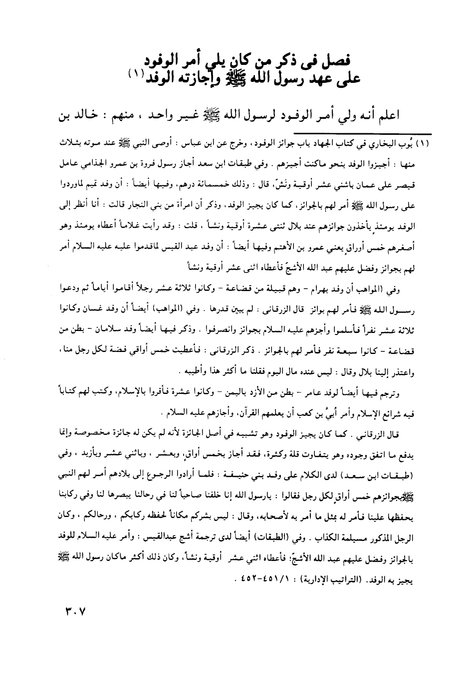 [ (1) ] بوب البخاري في كتاب الجهاد باب جوائز الوفود، وخرج عن ابن عباس: أوصى النبي صلى اللَّه عليه وسلم عند موته بثلاث منها: أجيزوا الوفد بنحو ما كنت أجيزهم. وفي طبقات ابن سعد أجاز رسول فروة بن عمرو الجذامي عامل قيصر على عمان باثني عشر أوقية ونشّ، قال: وذلك خمسمائة درهم، وفيها أيضا: أن وفد تميم لما وردوا على رسول اللَّه صلى اللَّه عليه وسلم أمر لهم بالجوائز، كما كان يجيز الوفد، وذكر أن امرأة من بني النجار قالت: أنا انظر إلى الوفد يومئذ يأخذون جوائزهم عند بلال ثنتى عشرة أوقية ونشا، قلت: وقد رأيت غلاما أعطاه يومئذ وهو أصغرهم خمس أوراق يعني عمرو بن الأهتم وفيها أيضا: أن وفد عبد القيس لما قدموا عليه عليه السلام أمر لهم بجوائز وفضل عليهم عبد اللَّه الأشجّ فأعطاه اثنى عشر أوقية ونشا.