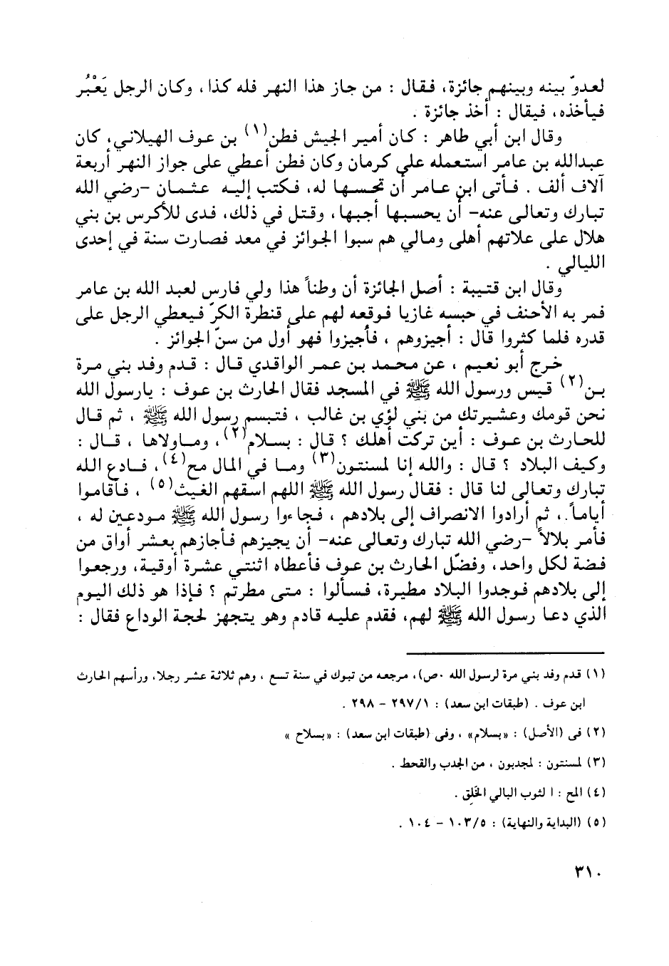 وكيف البلاد؟ قال: واللَّه إنا لمسنتون [ (3) ] وما في المال مح [ (4) ] ، فادع اللَّه تبارك وتعالى لنا قال: فقال رسول اللَّه صلى اللَّه عليه وسلم اللَّهمّ اسقهم الغيث [ (5) ] ، فأقاموا أياما، ثم أرادوا الانصراف إلى بلادهم، فجاءوا رسول اللَّه صلى اللَّه عليه وسلم مودعين له، فأمر بلالا- رضي اللَّه تبارك وتعالى عنه- أن يجيزهم فأجازهم بعشر أواق من فضة لكل واحد، وفضّل الحارث بن عوف فأعطاه اثنتي عشرة أوقية، ورجعوا إلى بلادهم فوجدوا البلاد مطيرة، فسألوا: متى مطرتم؟ فإذا هو ذلك اليوم الّذي دعا رسول اللَّه صلى اللَّه عليه وسلم لهم، فقدم عليه قادم وهو يتجهز لحجة الوداع فقال: