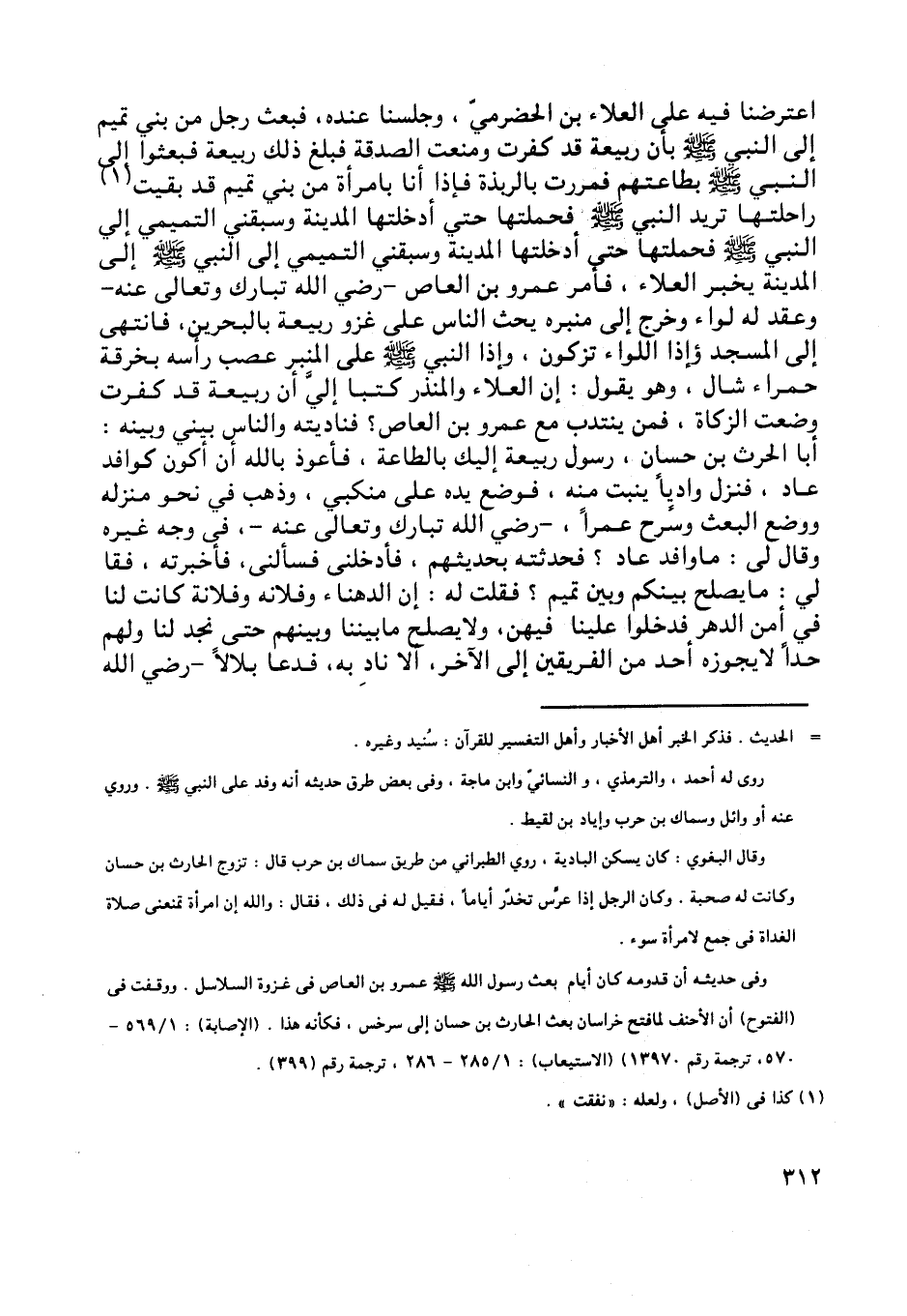 اعترضنا فيه على العلاء بن الحضرميّ، وجلسنا عنده، فبعث رجل من بني تميم إلى النبي صلى اللَّه عليه وسلم بأن ربيعة قد كفرت ومنعت الصدقة فبلغ ذلك ربيعة فبعثوا إلى النبي صلى اللَّه عليه وسلم بطاعتهم فمررت بالربذة فإذا أنا بامرأة من بني تميم قد بقيت [ (1) ] راحلتها تريد النبي صلى اللَّه عليه وسلم فحملتها حتى أدخلتها المدينة وسبقني التميمي إلي النبي صلى اللَّه عليه وسلم فحملتها حتى أدخلتها المدينة وسبقني التميمي إلى النبي صلى اللَّه عليه وسلم إلى المدينة يخبر العلاء، فأمر عمرو بن العاص- رضي اللَّه تبارك وتعالى عنه- وعقد له لواء وخرج إلى منبره يحث الناس على غزو ربيعة بالبحرين، فانتهى إلى المسجد وإذا اللواء تزكون، وإذا النبي صلى اللَّه عليه وسلم على المنبر عصب رأسه بخرقة حمراء شال، وهو يقول: إن العلاء والمنذر كتبا إليّ أن ربيعة قد كفرت وضعت الزكاة، فمن ينتدب مع عمرو بن العاص؟ فناديته والناس بيني وبينه: