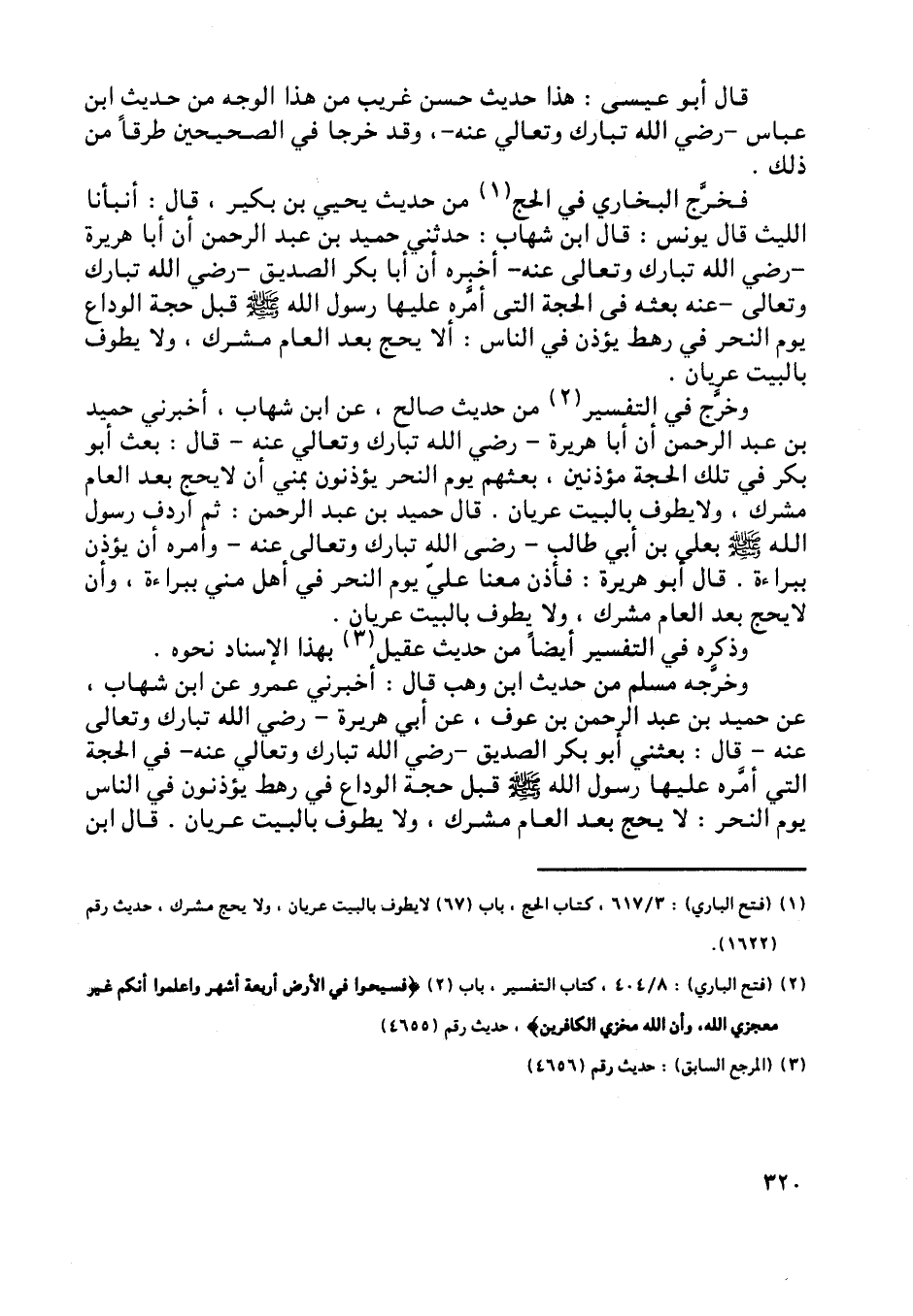 [ (1) ] (فتح الباري) : 3/ 617، كتاب الحج، باب (67) لا يطوف بالبيت عريان، ولا يحج مشرك، حديث رقم (1622) .
