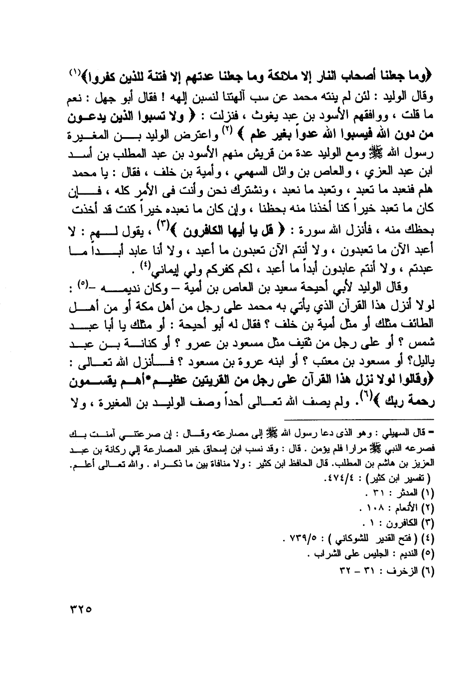 وَما جَعَلْنا أَصْحابَ النَّارِ إِلَّا مَلائِكَةً وَما جَعَلْنا عِدَّتَهُمْ إِلَّا فِتْنَةً لِلَّذِينَ كَفَرُوا [ (1) ] وقال الوليد: لئن لم ينته محمد عن سب آلهتنا لنسبن إلهه! فقال أبو جهل: نعم ما قلت، ووافقهم الأسود بن عبد يغوث، فنزلت: وَلا تَسُبُّوا الَّذِينَ يَدْعُونَ مِنْ دُونِ اللَّهِ فَيَسُبُّوا اللَّهَ عَدْواً بِغَيْرِ عِلْمٍ [ (2) ] واعترض الوليد بن المغيرة رسول اللَّه صلّى اللَّه عليه وسلم ومع الوليد عدة من قريش منهم الأسود بن عبد المطلب بن أسد ابن عبد العزي، والعاص بن وائل السهمي، وأمية بن خلف، فقال: يا محمد هلم فنعبد ما تعبد، وتعبد ما نعبد، ونشترك نحن وأنت في الأمر كله، فإن كان ما تعبد خيرا كنا أخذنا منه بحظنا، وإن كان ما نعبده خيرا كنت قد أخذت بحظك منه، فأنزل اللَّه سورة: قُلْ يا أَيُّهَا الْكافِرُونَ [ (3) ] ، يقول لهم: لا أعبد الآن ما تعبدون، ولا أنتم الآن تعبدون ما أعبد، ولا أنا عابد أبدا ما عبدتم، ولا أنتم عابدون أبدا ما أعبد، لكم كفركم ولي إيماني [ (4) ] .