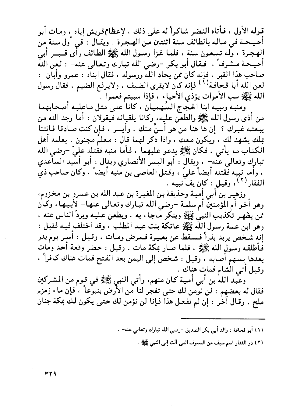 ومنبه ونبيه ابنا الحجاج السّهميان، كانا على مثل ما عليه أصحابهما من أذى رسول اللَّه صلّى اللَّه عليه وسلم والطعن عليه، وكانا يلقيانه فيقولان: أما وجد اللَّه من يبعثه غيرك؟ إن هاهنا من هو أسنّ منك، وأيسر، فإن كنت صادقا فائتنا بملك يشهد لك، ويكون معك، وإذا ذكر لهما قال: معلم مجنون، يعلمه أهل الكتاب ما يأتي، فكان صلّى اللَّه عليه وسلم يدعو عليهما، فأما منبه فقتله عليّ- رضي اللَّه تبارك وتعالى عنه-، ويقال: أبو اليسر الأنصاري ويقال: أبو أسيد الساعدي، وأما نبيه فقتله أيضا عليّ، وقتل العاصي بن منبه أيضا، وكان صاحب ذي الفقار [ (2) ] ، وقيل: كان يف نبيه.