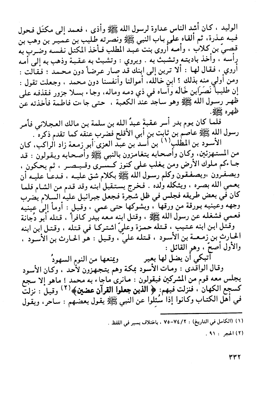 وقال الواقدي: ومات الأسود بمكة وهم يتجهزون لأحد، وكان الأسود يجلس معه قوم من المشركين فيقولون: ما نرى ما جاء به محمد! ما هو إلا سجع كسجع الكهان، فنزلت فيهم: الَّذِينَ جَعَلُوا الْقُرْآنَ عِضِينَ [ (2) ] وقيل: نزلت في أهل الكتاب وكانوا إذا سئلوا عن النبي صلّى اللَّه عليه وسلم يقول بعضهم: ساحر، ويقول