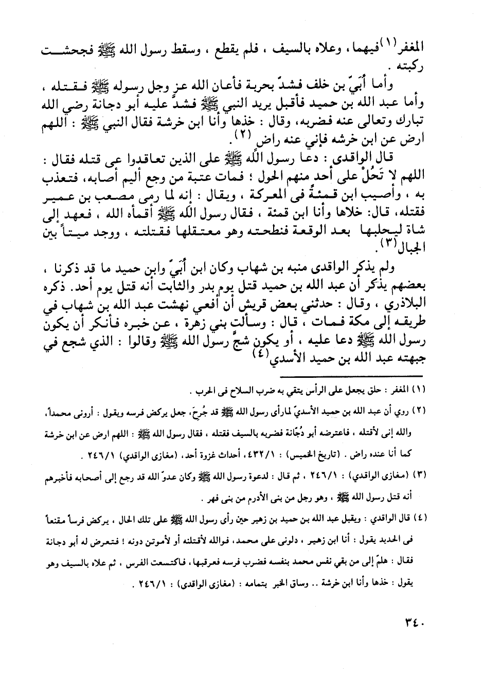 [ (4) ] قال الواقدي: ويقبل عبد اللَّه بن حميد بن زهير حين رأى رسول اللَّه صلّى اللَّه عليه وسلم على تلك الحال، يركض فرسا مقنعا في الحديد يقول: أنا ابن زهير، دلوني على محمد، فو اللَّه لأقتلنه أو لأموتن دونه! فتعرض له أبو دجانة فقال: هلمّ إلى من بقي نفس محمد بنفسه فضرب فرسه فعرقبها، فاكتسعت الفرس، ثم علاه بالسيف وهو يقول: خذها وأنا ابن خرشة.. وساق الخبر بتمامه: (مغازي الواقدي) : 1/ 246.