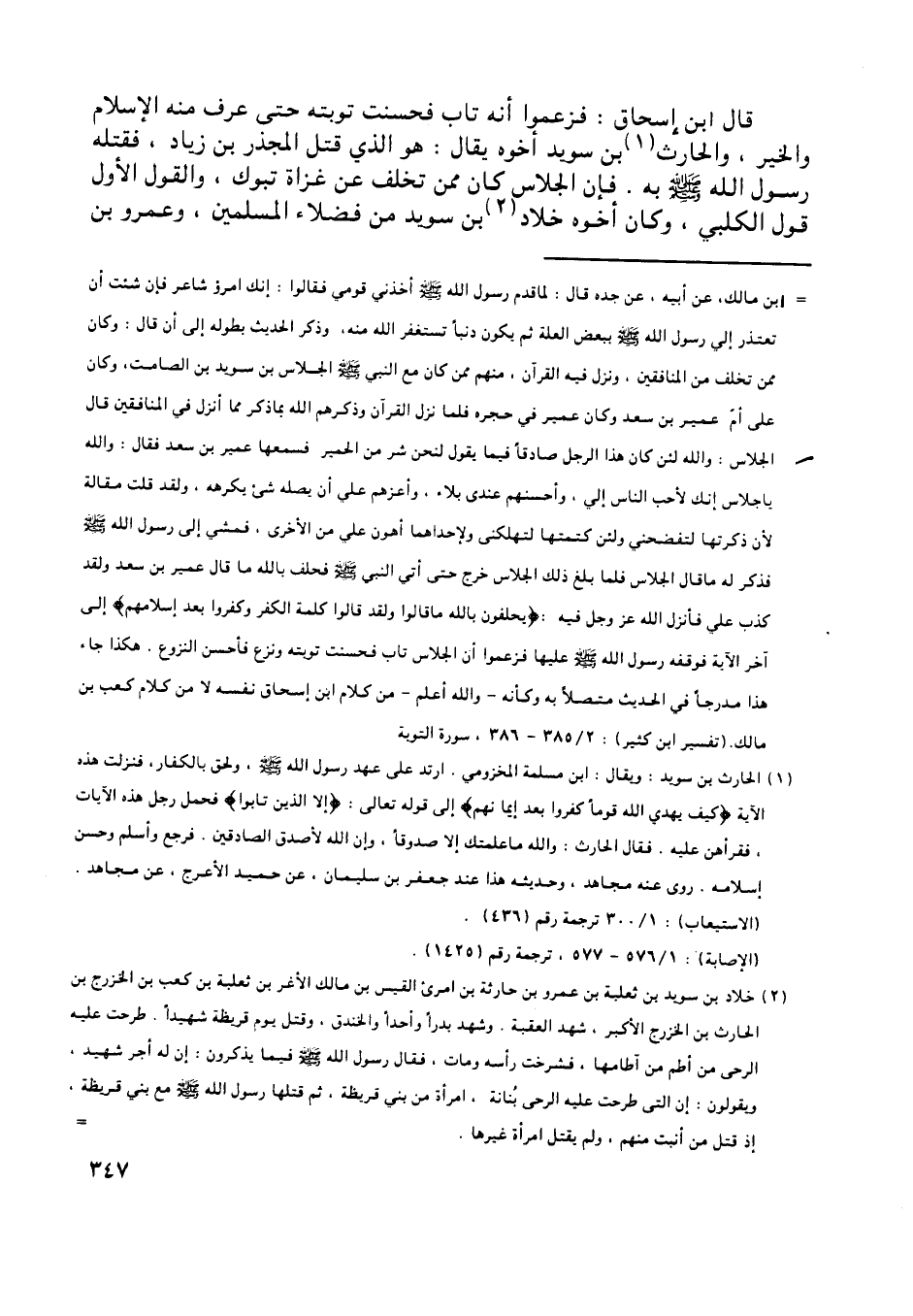 قال ابن إسحاق: فزعموا أنه تاب فحسنت توبته حتى عرف منه الإسلام والخير، والحارث [ (1) ] بن سويد أخوه يقال: هو الّذي قتل المجذر بن زياد، فقتله رسول اللَّه صلى اللَّه عليه وسلم به. فإن الجلاس كان ممن تخلف عن غزاة تبوك، والقول الأول قول الكلبي، وكان أخوه خلاد [ (2) ] بن سويد من فضلاء المسلمين، وعمرو بن