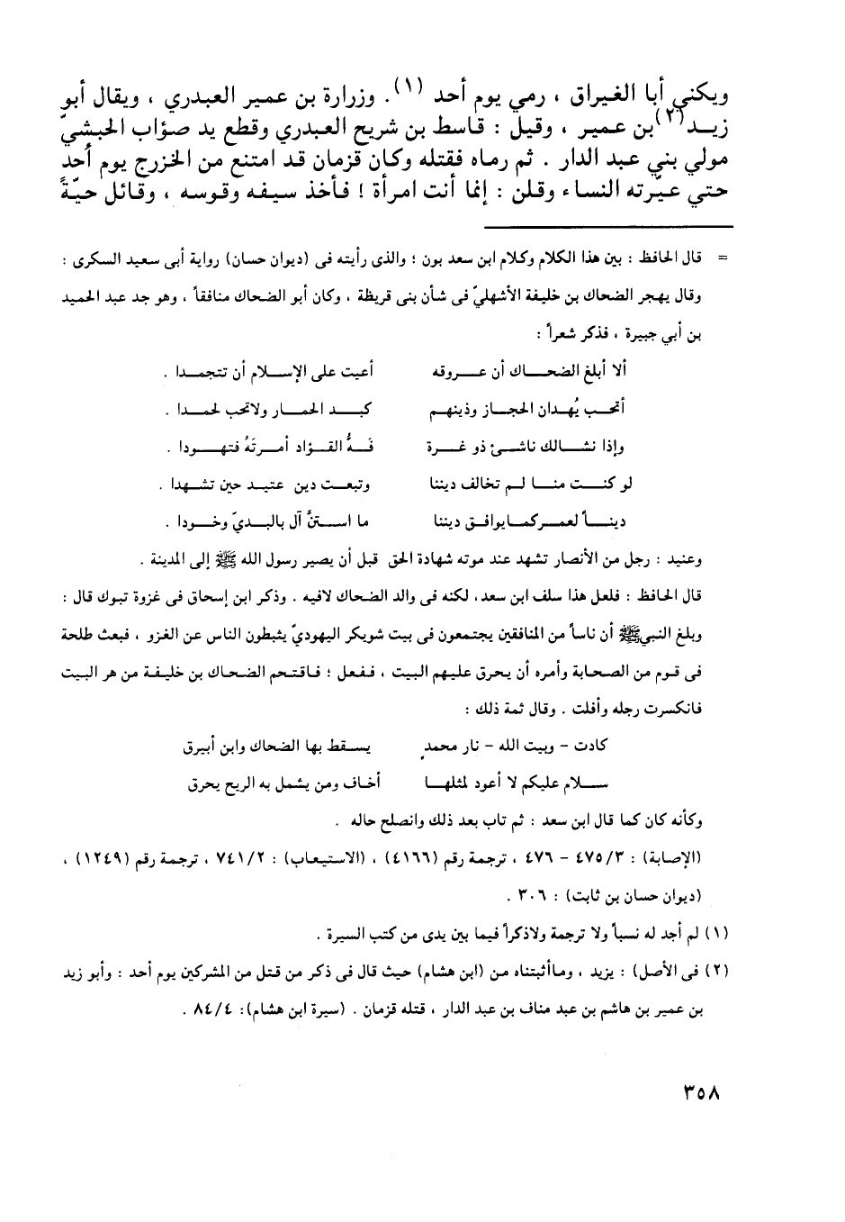 [ () ] قال الحافظ: بين هذا الكلام وكلام ابن سعد بون، والّذي رأيته في (ديوان حسان) رواية أبى سعيد السكرى، وقال يهجر الضحاك بن خليفة الأشهليّ في شأن بنى قريظة، وكان أبو الضحاك منافقا، وهو جد عبد الحميد بن أبي جبيرة، فذكر شعرا: