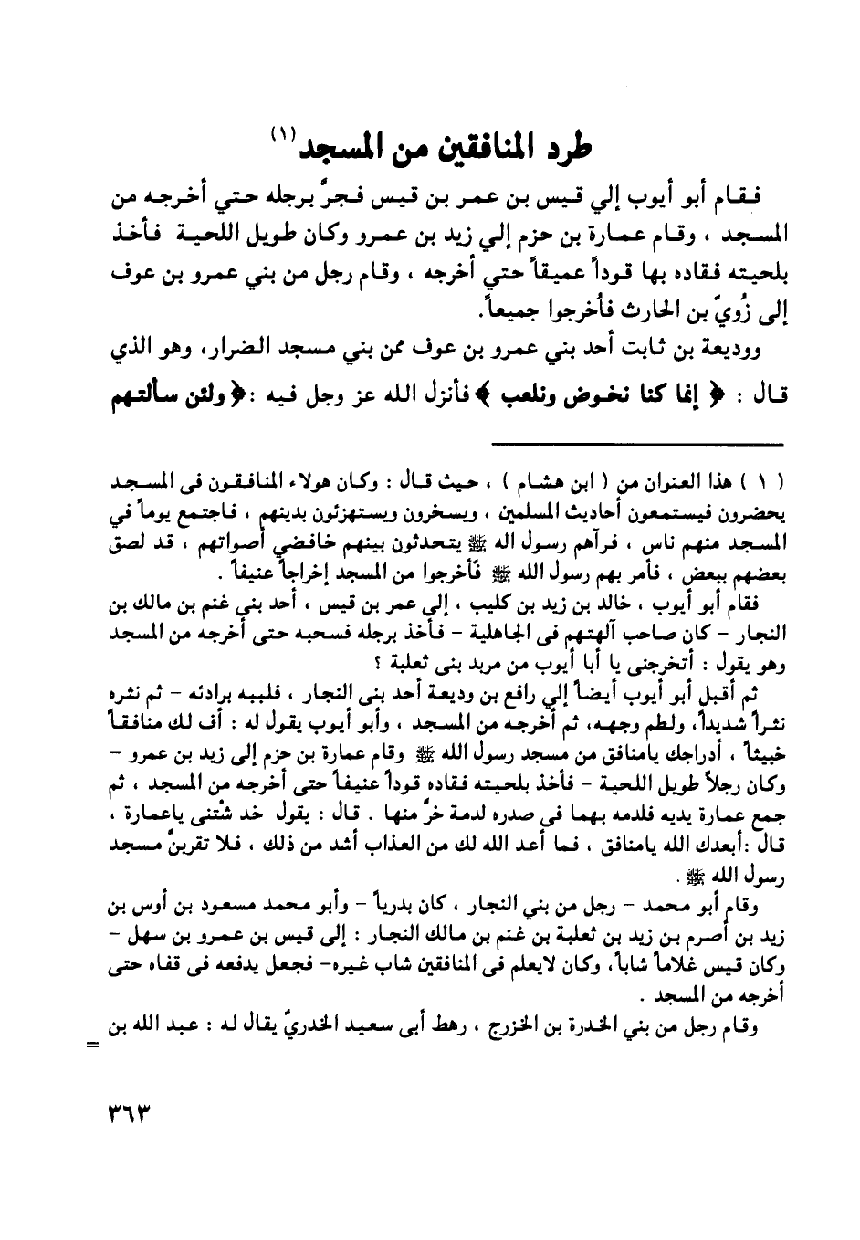 [ (1) ] هذا العنوان من (ابن هشام) ، حديث قال: وكان هؤلاء المنافقون في المسجد يحضرون فيستمعون أحاديث المسلمين، ويسخرون ويستهزءون بدينهم، فاجتمع يوما في المسجد منهم ناس، فرآهم رسول اللَّه صلّى اللَّه عليه وسلّم يتحدثون بينهم خافضي أصواتهم، قد لصق بعضهم ببعض، فأمر بهم رسول اللَّه صلّى اللَّه عليه وسلّم فأخرجوا من المسجد إخراجا عنيفا.