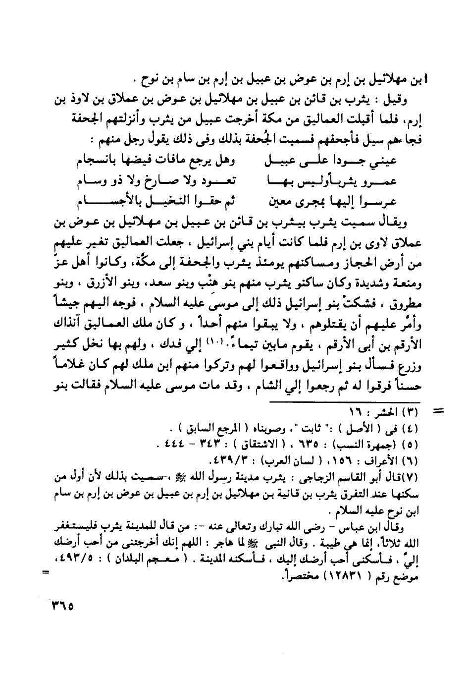 وقيل: يثرب بن قائن بن عبيل بن مهلائيل بن عوض بن عملاق بن لاوذ بن إرم، فلما أقبلت العماليق من مكة أخرجت عبيل من يثرب وأنزلتهم الجحفة فجاءهم سيل فأجحفهم فسميت الجحفة بذلك وفي ذلك يقول رجل منهم: