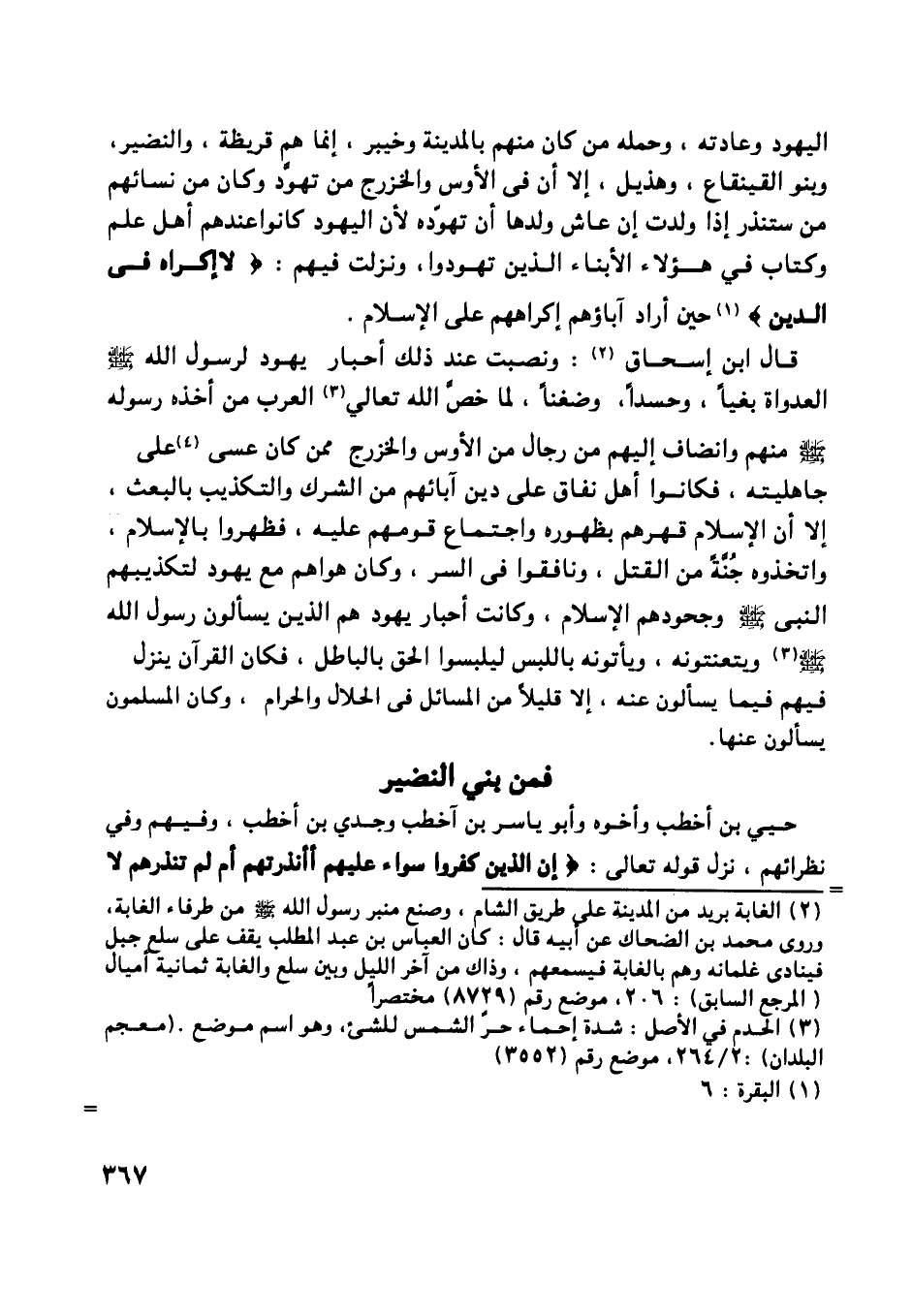 اليهود وعادته، وحمله من كان منهم بالمدينة وخيبر، إنما هم قريظة، والنضير، وبنو القينقاع، وهذيل، إلا أن في الأوس والخزرج من تهوّد وكان من نسائهم من ستنذر إذا ولدت إن عاش ولدها أن تهوّده لأن اليهود كانوا عندهم أهل علم وكتاب في هؤلاء الأبناء الذين تهودوا، ونزلت فيهم: لا إِكْراهَ فِي الدِّينِ [ (1) ] حين أراد آباؤهم إكراههم على الإسلام.