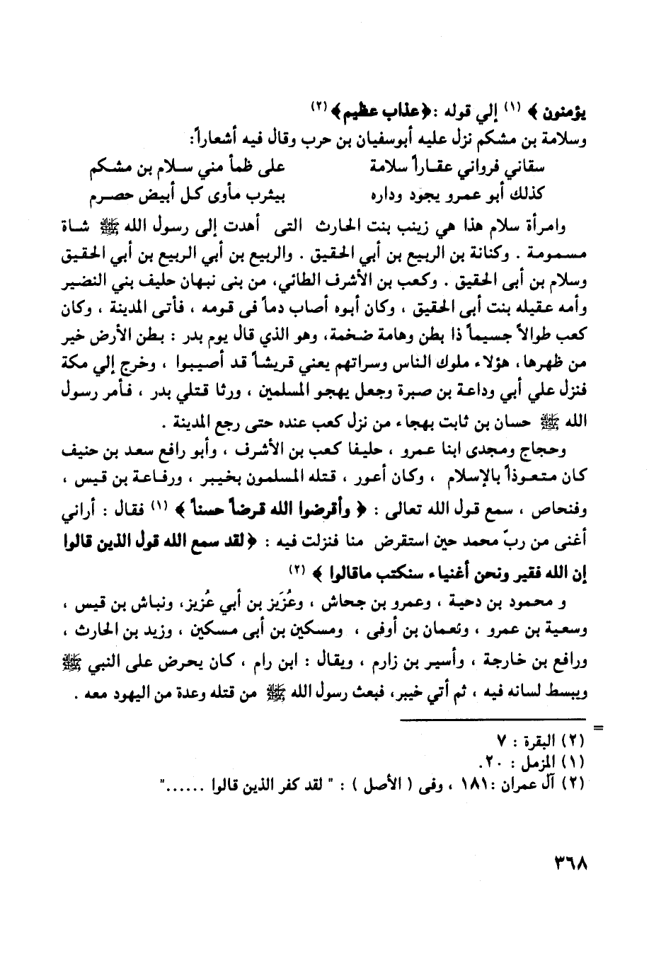 [ (1) ] إلي قوله: عَذابٌ عَظِيمٌ وسلامة بن مشكم نزل عليه أبو سفيان بن حرب وقال فيه أشعارا: