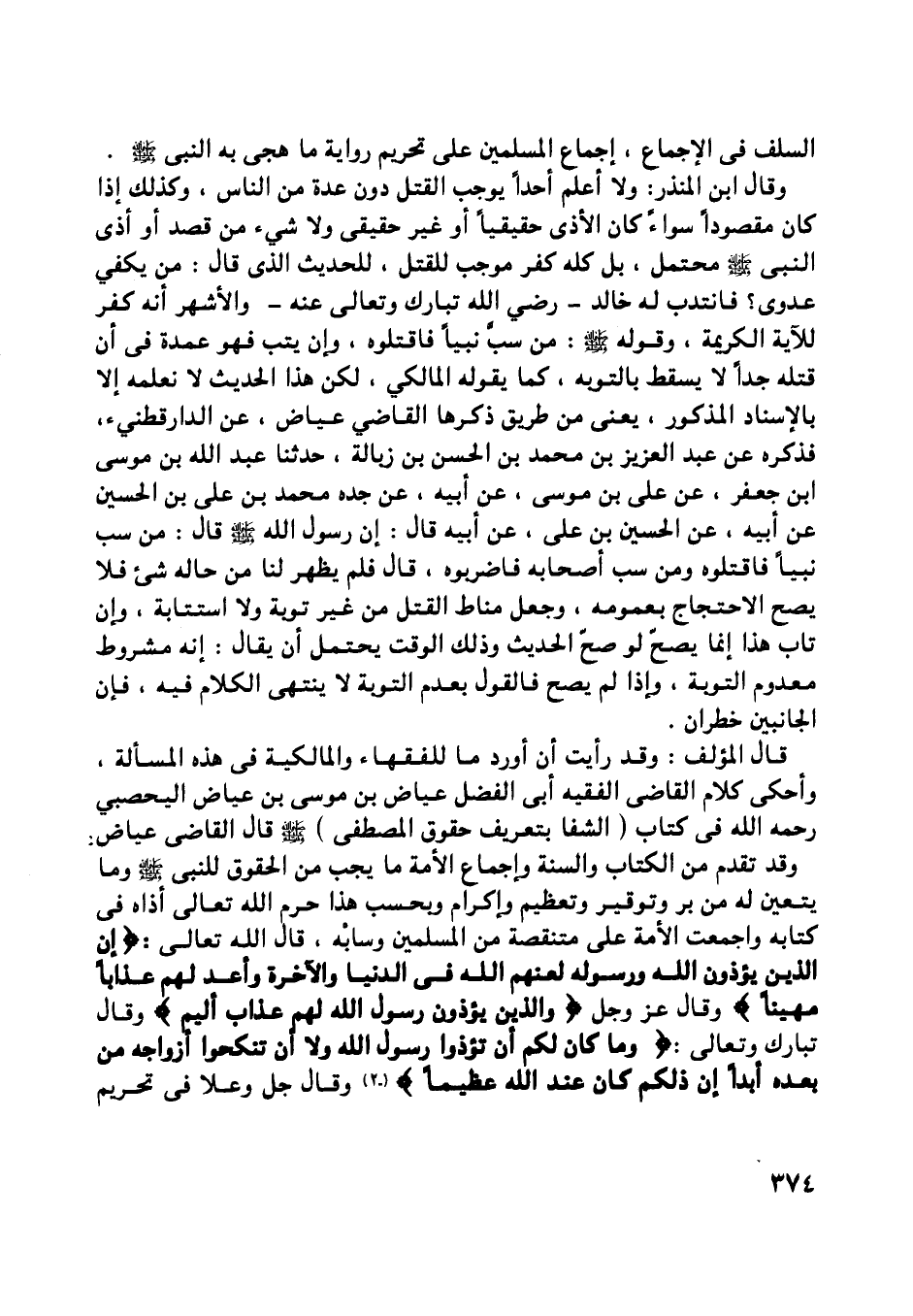 وقد تقدم من الكتاب والسنة وإجماع الأمة ما يجب من الحقوق للنّبيّ صلّى اللَّه عليه وسلّم وما يتعين له من بر وتوقير وتعظيم وإكرام وبحسب هذا حرم اللَّه تعالى أذاه في كتابه وأجمعت الأمة على قتل متنقصه من المسلمين وسابه، قال اللَّه تعالى: إِنَّ الَّذِينَ يُؤْذُونَ اللَّهَ وَرَسُولَهُ لَعَنَهُمُ اللَّهُ فِي الدُّنْيا وَالْآخِرَةِ وَأَعَدَّ لَهُمْ عَذاباً مُهِيناً وقال عز وجل وَالَّذِينَ يُؤْذُونَ رَسُولَ اللَّهِ لَهُمْ عَذابٌ أَلِيمٌ وقال تبارك وتعالى: وَما كانَ لَكُمْ أَنْ تُؤْذُوا رَسُولَ اللَّهِ وَلا أَنْ تَنْكِحُوا أَزْواجَهُ مِنْ بَعْدِهِ أَبَداً إِنَّ ذلِكُمْ كانَ عِنْدَ اللَّهِ عَظِيماً وقال جل وعلا في تحريم