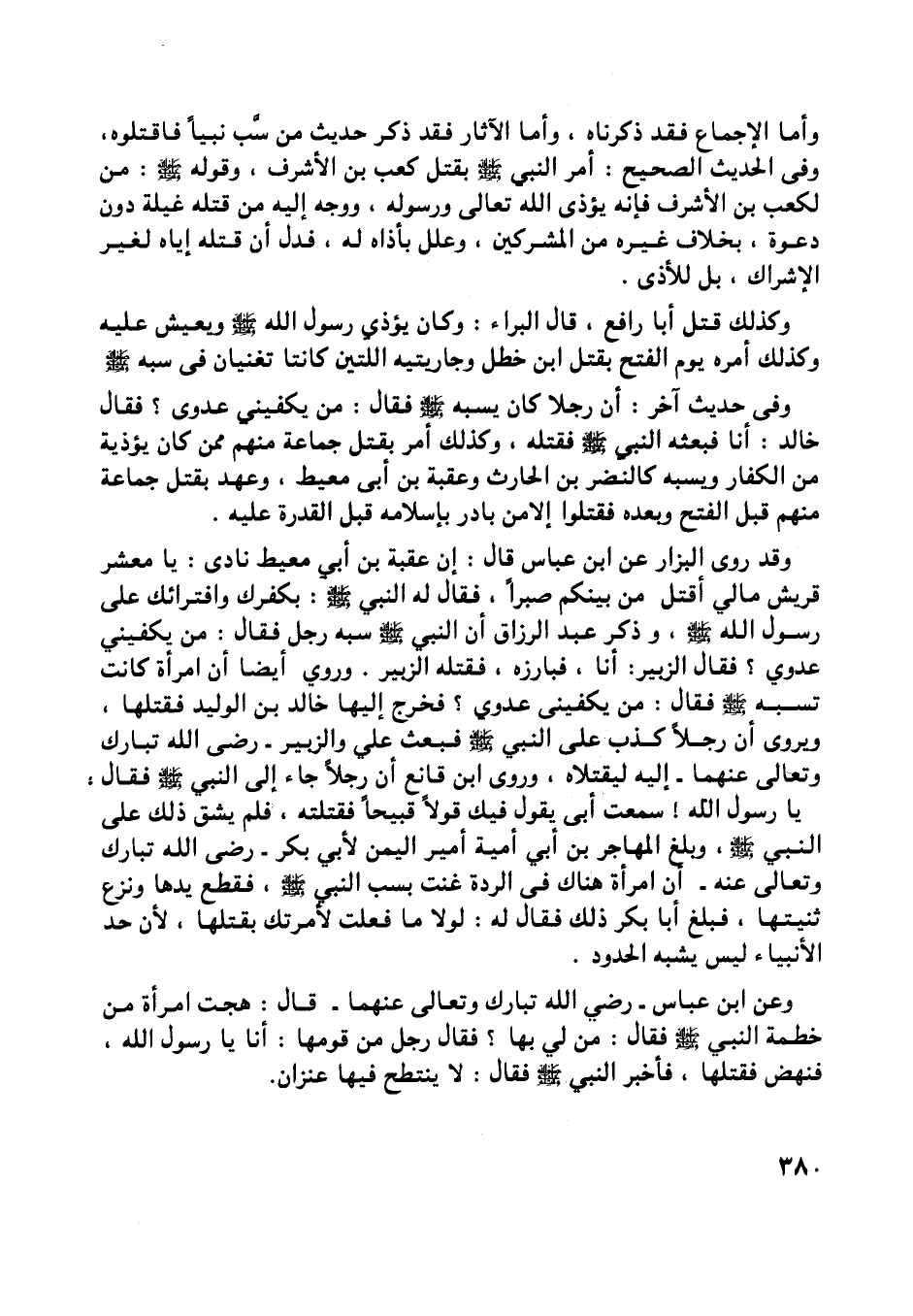 يا رسول اللَّه! سمعت أبى يقول فيك قولا قبيحا فقتلته، فلم يشق ذلك على النبي صلّى اللَّه عليه وسلّم، وبلغ المهاجر بن أبي أمية أمير اليمن لأبي بكر- رضي اللَّه تبارك وتعالى عنه- أن امرأة هناك في الردة غنت بسب النبي صلّى اللَّه عليه وسلّم، فقطع يدها ونزع ثنيتها، فبلغ أبا بكر ذلك فقال له: لولا ما فعلت لأمرتك بقتلها، لأن حد الأنبياء ليس يشبه الحدود.