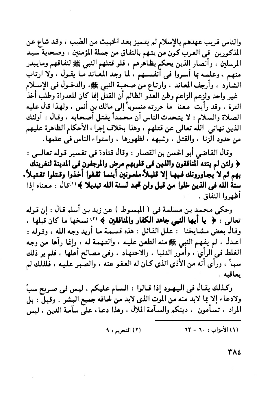 وحكى محمد بن مسلمة في (المبسوط) عن زيد بن أسلم قال: إن قوله تعالى: يا أَيُّهَا النَّبِيُّ جاهِدِ الْكُفَّارَ وَالْمُنافِقِينَ* [ (2) ] نسخها ما كان قبلها، وقال بعض مشايخنا: علل القائل: هذه قسمة ما أريد وجه اللَّه، وقوله: