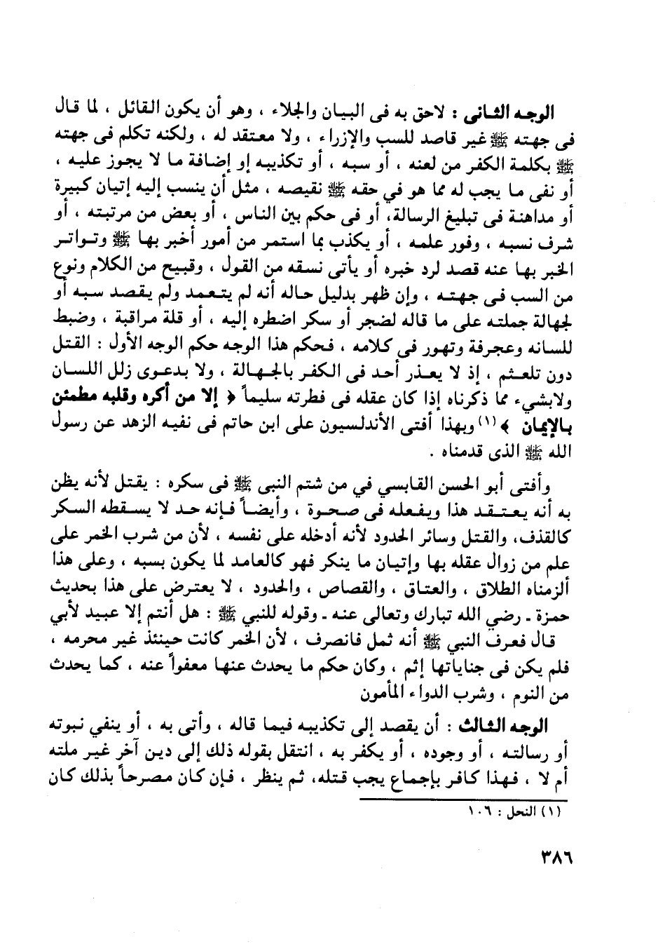 الوجه الثاني: لاحق به في البيان والجلاء، وهو أن يكون القائل، لما قال في جهته صلّى اللَّه عليه وسلّم غير قاصد للسب والإزراء، ولا معتقد له، ولكنه تكلم في جهته صلّى اللَّه عليه وسلّم بكلمة الكفر من لعنه، أو سبه، أو تكذيبه أو إضافة ما لا يجوز عليه، أو نفى ما يجب له مما هو في حقه صلّى اللَّه عليه وسلّم نقيصه، مثل أن ينسب إليه إتيان كبيرة أو مداهنة في تبليغ الرسالة، أو في حكم بين الناس، أو بعض من مرتبته، أو شرف نسبه، وفور علمه، أو يكذب بما استمر من أمور أخبر بها صلّى اللَّه عليه وسلّم وتواتر الخبر بها عنه قصد لرد خبره أو يأتى نسقه من القول، وقبيح من الكلام ونوع من السب في جهته، وإن ظهر بدليل حاله أنه لم يتعمد ولم يقصد سبه أو لجهالة جملته على ما قاله لضجر أو سكر اضطره إليه، أو قلة مراقبة، وضبط للسانه وعجرفة وتهور في كلامه، فحكم هذا الوجه حكم الوجه الأول: القتل دون تلعثم، إذ لا يعذر أحد في الكفر بالجهالة، ولا بدعوى زلل اللسان ولا بشيء مما ذكرناه إذا كان عقله في فطرته سليما إِلَّا مَنْ أُكْرِهَ وَقَلْبُهُ مُطْمَئِنٌّ بِالْإِيمانِ [ (1) ] وبهذا أفتى الأندلسيون على ابن حاتم في نفيه الزهد عن رسول اللَّه صلّى اللَّه عليه وسلّم الّذي قدمناه.