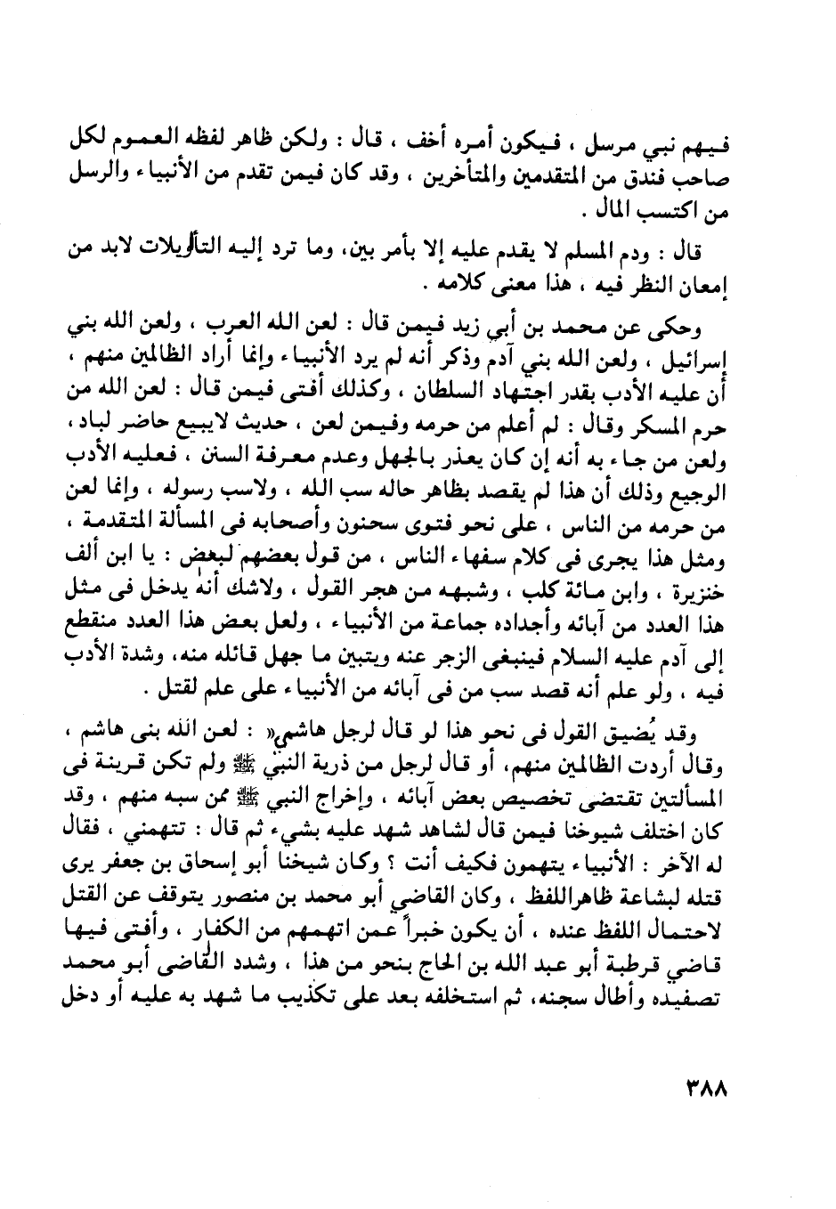 وقد يضيق القول في نحو هذا لو قال لرجل هاشمي «: لعن اللَّه بنى هاشم، وقال أردت الظالمين منهم، أو قال لرجل من ذرية النبي صلّى اللَّه عليه وسلّم ولم تكن قرينة في المسألتين تقتضي تخصيص بعض آبائه، وإخراج النبي صلّى اللَّه عليه وسلّم ممن سبه منهم، وقد كان اختلف شيوخنا فيمن قال لشاهد شهد عليه بشيء ثم قال: تتهمني، فقال له الآخر: الأنبياء يتهمون فكيف أنت؟ وكان شيخنا أبو إسحاق بن جعفر يرى قتله لبشاعة ظاهر اللفظ، وكان القاضي أبو محمد بن منصور يتوقف عن القتل لاحتمال اللفظ عنده، أن يكون خبرا عمن اتهمهم من الكفار، وأفتى فيها قاضي قرطبة أبو عبد اللَّه بن الحاج بنحو من هذا، وشدد القاضي أبو محمد تصفيده وأطال سجنه، ثم استخلفه بعد على تكذيب ما شهد به عليه أو دخل