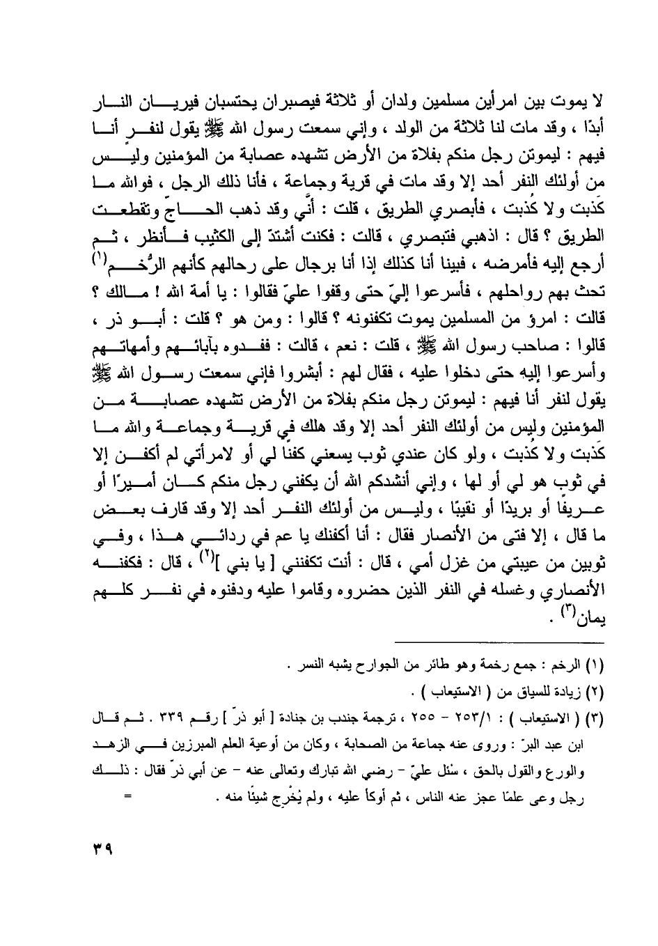 لا يموت بين امرأين مسلمين ولدان أو ثلاثة فيصبران يحتسبان فيريان النار أبدا، وقد مات لنا ثلاثة من الولد، وإني سمعت رسول اللَّه صلّى اللَّه عليه وسلّم يقول لنفر أنا فيهم: ليموتن رجل منكم بفلاة من الأرض تشهده عصابة من المؤمنين وليس من أولئك النفر أحد إلا وقد مات في قرية وجماعة، فأنا ذلك الرجل، فو اللَّه ما كذبت ولا كذبت،