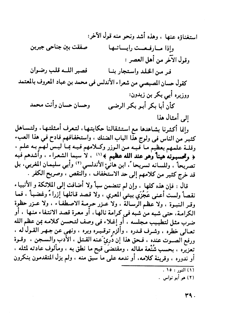 وإنما أكثرنا بشاهدها مع استثقالنا حكايتها، لتعرف أمثلتها، ولتساهل كثير من الناس في ولوج هذا الباب الضنك، واستخفافهم فادح في هذا العبء وقلة علمهم بعظيم ما فيه من الوزر وكلامهم فيه بما ليس لهم به علم، وَتَحْسَبُونَهُ هَيِّناً وَهُوَ عِنْدَ اللَّهِ عَظِيمٌ [ (1) ] ، لا سيما الشعراء، وأشدهم فيه تصريحا، وللسانه تسريحا، ابن هانئ الأندلسي [ (2) ] وأبي سليمان المغربي، بل قد خرج كثير من كلامهم إلى حد الاستخفاف، والنقص، وصريح الكفر.