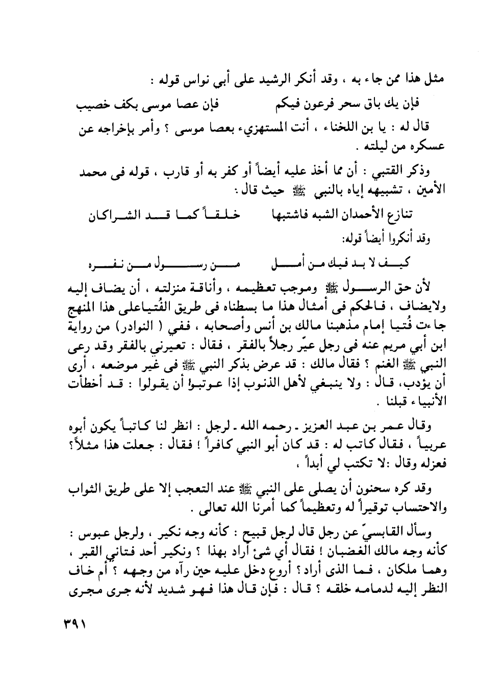 لأن حق الرسول صلّى اللَّه عليه وسلّم وموجب تعظيمه، وأناقة منزلته، أن يضاف إليه ولا يضاف، فالحكم في أمثال هذا ما بسطناه في طريق الفتيا على هذا المنهج جاءت فتيا إمام مذهبنا مالك بن أنس وأصحابه، ففي (النوادر) من رواية ابن أبي مريم عنه في رجل عيّر رجلا بالفقر، فقال: تعيرني بالفقر وقد رعى النبي صلّى اللَّه عليه وسلّم الغنم؟ فقال مالك: قد عرض بذكر النبي صلّى اللَّه عليه وسلّم في غير موضعه، أرى أن يؤدب، قال: ولا ينبغي لأهل الذنوب إذا عوتبوا أن يقولوا: قد أخطأت الأنبياء قبلنا.