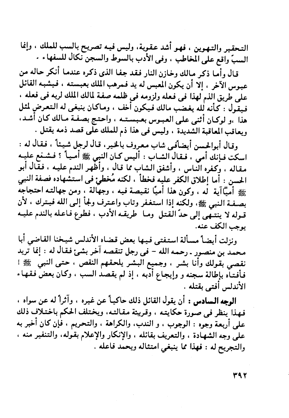 ونزلت أيضا مسألة استفتى فيها بعض قضاه الأندلس شيخنا القاضي أبا محمد بن منصور- رحمه اللَّه- في رجل تنقصه آخر بشيء فقال له: إنما تريد نقصي بقولك وأنا بشر، وجميع البشر يلحقهم النقص، حتى النبي صلّى اللَّه عليه وسلّم! فأفتاه بإطالة سجنه وإيجاع أدبه، إذ لم يقصد السب، وكان بعض فقهاء الأندلس أفتى بقتله.
