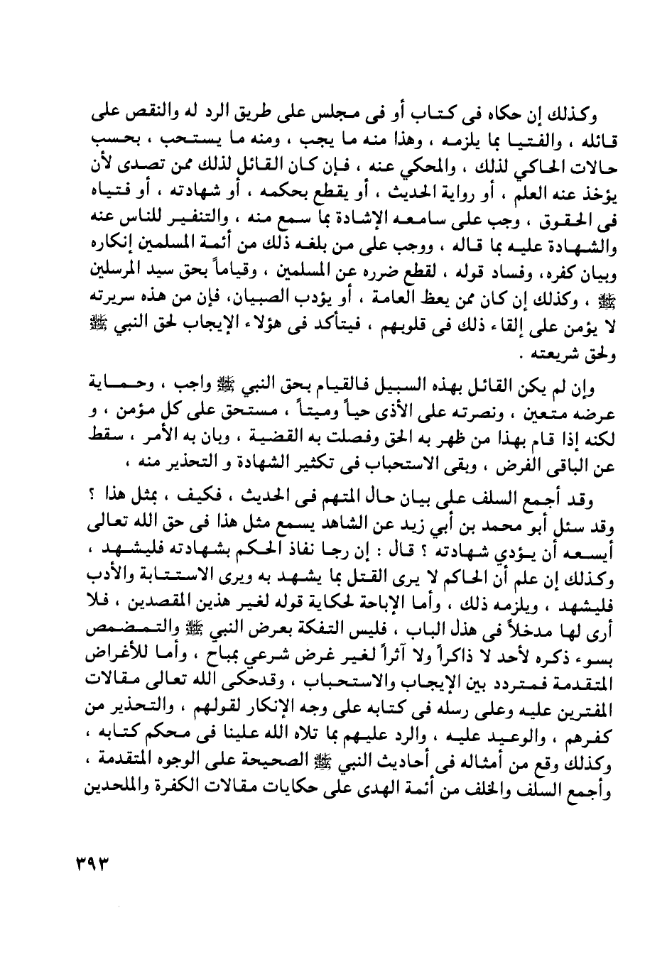 وإن لم يكن القائل بهذه السبيل فالقيام بحق النبي صلّى اللَّه عليه وسلّم واجب، وحماية عرضه متعين، ونصرته على الأذى حيا وميتا، مستحق على كل مؤمن، ولكنه إذا قام بهذا من ظهر به الحق وفصلت به القضية، وبان به الأمر، سقط عن الباقي الفرض، وبقي الاستحباب في تكثير الشهادة، والتحذير منه.