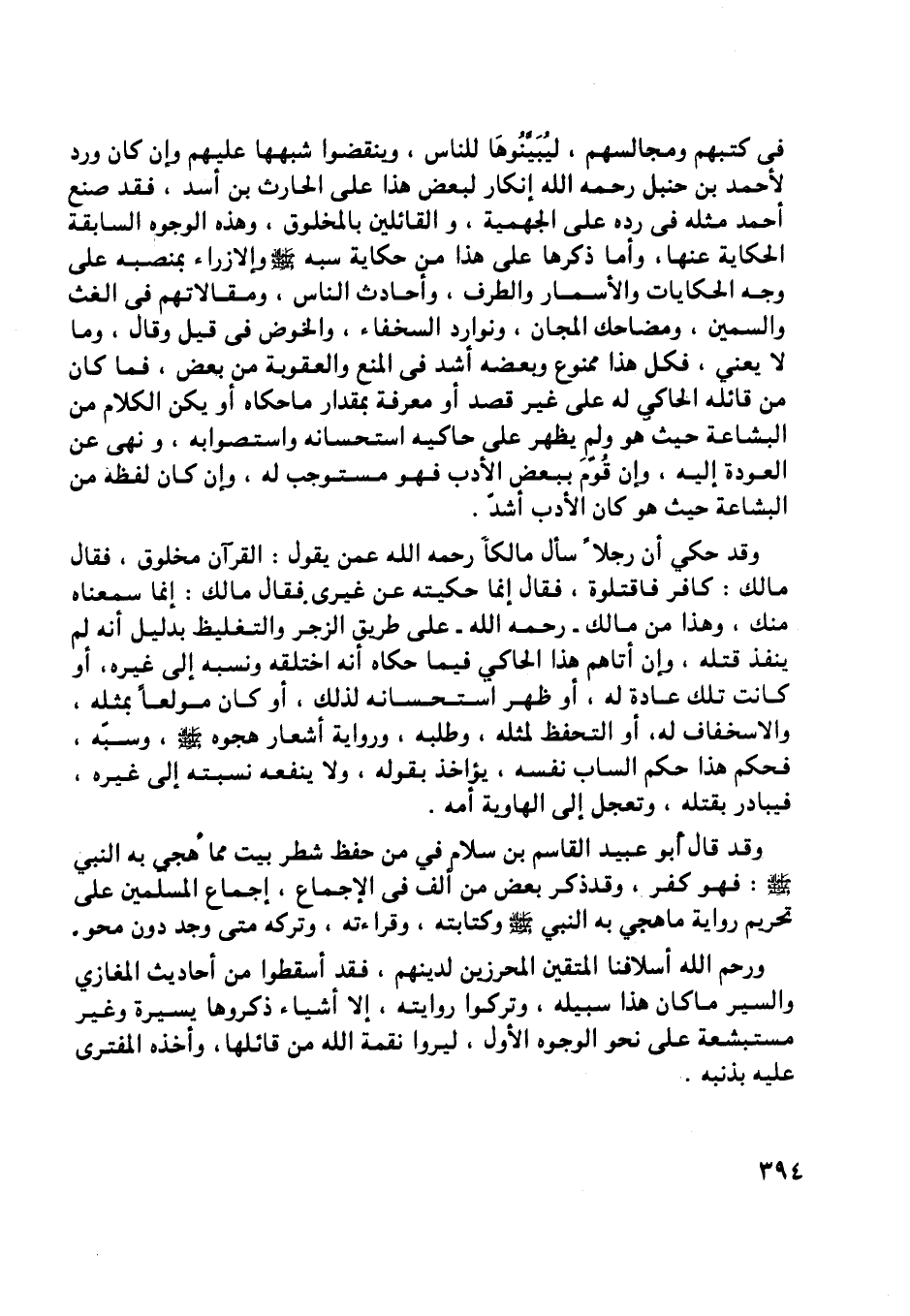 في كتبهم ومجالسهم، ليبيّنوها للناس، وينقضوا شبهها عليهم وإن كان ورد لأحمد بن حنبل رحمه اللَّه إنكار لبعض هذا على الحارث بن أسد، فقد صنع أحمد مثله في رده على الجهمية، والقائلين بالمخلوق، وهذه الوجوه السابقة الحكاية عنها، وأما ذكرها على هذا من حكاية سبه صلى اللَّه عليه وسلم والإزراء بمنصبه على وجه الحكايات والأسمار والطرف، وأحادث الناس، ومقالاتهم في الغث والسمين، ومضاحك المجان، ونوارد السخفاء، والخوض في قيل وقال: وما لا يعني، فكل هذا ممنوع وبعضه أشد في المنع والعقوبة من بعض، فما كان من قائله الحاكي له على غير قصد أو معرفة بمقدار ما حكاه أو يكن الكلام من البشاعة حيث هو ولم يظهر على حاكيه استحسانه واستصوابه، ونهى عن العودة إليه، وإن قوّم ببعض الأدب فهو مستوجب له، وإن كان لفظه من البشاعة حيث هو كان الأدب أشدّ.