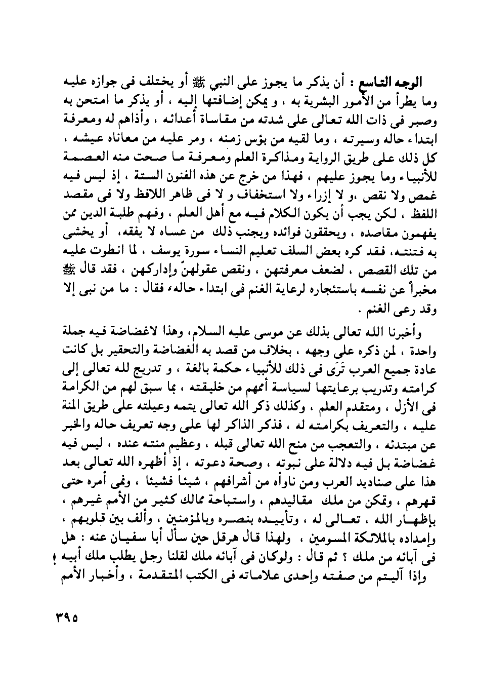 الوجه التاسع: أن يذكر ما يجوز على النبي صلّى اللَّه عليه وسلّم أو يختلف في جوازه عليه وما يطرأ من الأمور البشرية به، ويمكن إضافتها إليه، أو يذكر ما امتحن به وصبر في ذات اللَّه تعالى على شدته من مقاساة أعدائه، وأذاهم له ومعرفة ابتداء حاله وسيرته، وما لقيه من بؤس زمنه، ومر عليه من معاناة عيشه، كل ذلك على طريق الرواية ومذاكرة العلم ومعرفة ما صحت منه العصمة للأنبياء وما يجوز عليهم، فهذا من خرج عن هذه الفنون الستة، إذ ليس فيه غمص ولا نقص، ولا إزراء ولا استخفاف ولا في ظاهر اللافظ ولا في مقصد اللفظ، لكن يجب أن يكون الكلام فيه مع أهل العلم، وفهم طلبة الدين ممن يفهمون مقاصده، ويحققون فوائده ويجنب ذلك من عساه لا يفقه، أو يخشى به فتنته، فقد كره بعض السلف تعليم النساء سورة يوسف، لما انطوت عليه من تلك القصص، لضعف معرفتهن، ونقص عقولهنّ وإداركهن، فقد قال صلّى اللَّه عليه وسلّم مخبرا عن نفسه باستئجاره لرعاية الغنم في ابتداء حاله،